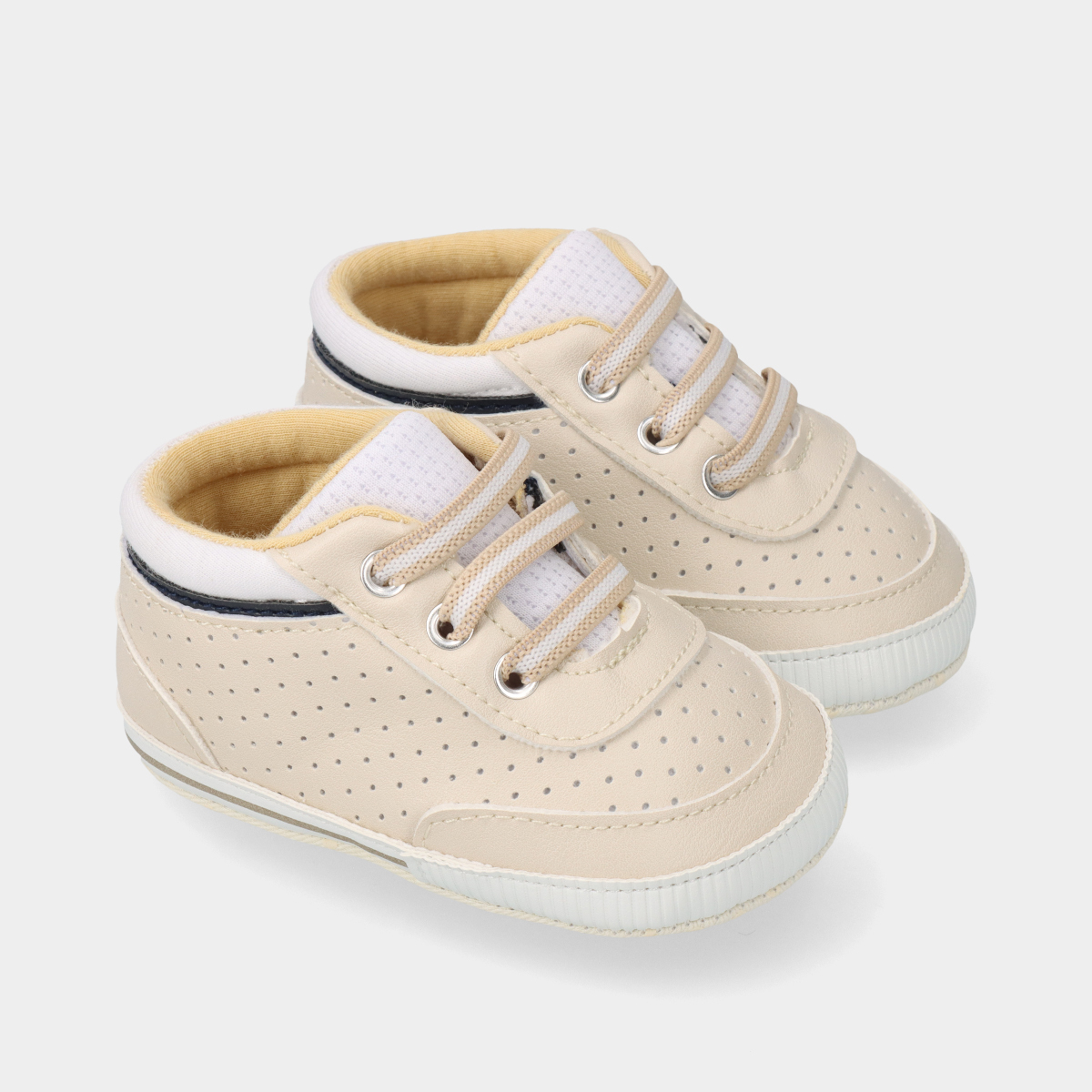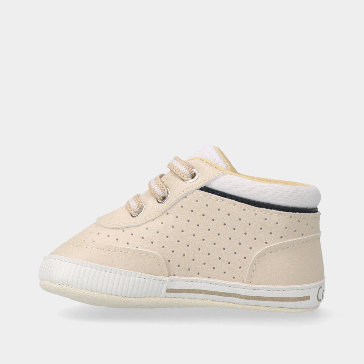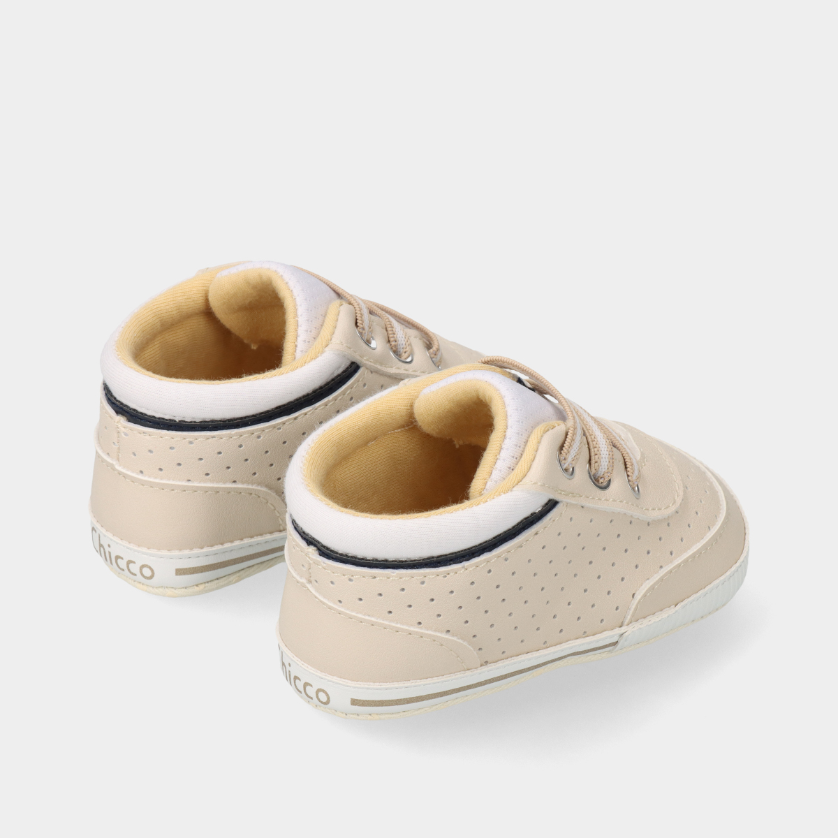As sapatilhas Chicco Ollino na cor bege, com detalhes em branco e azul, são uma escolha encantadora para bebés!