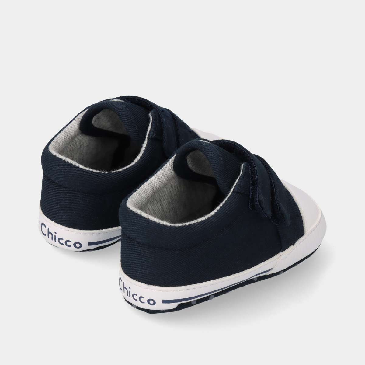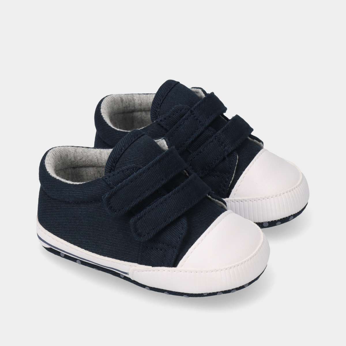 Tênis para bebé menino azul com pormenor branco, biqueira e dois velcros no peito do pé.