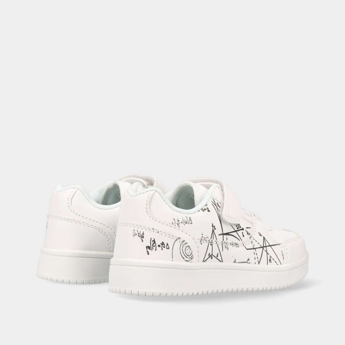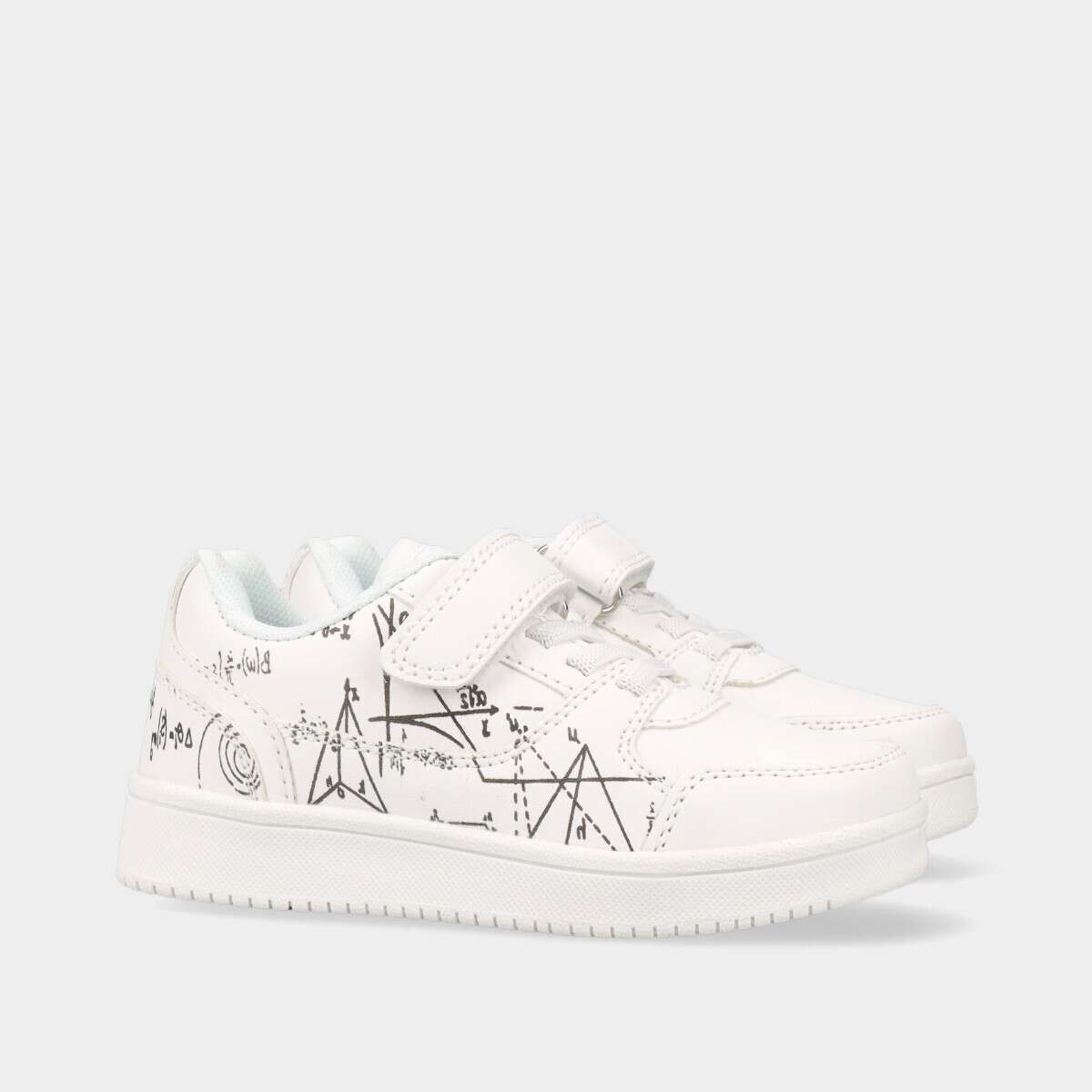 Tênis na cor branca com estampado divertido na lateral, de velcro e cordão elástico.