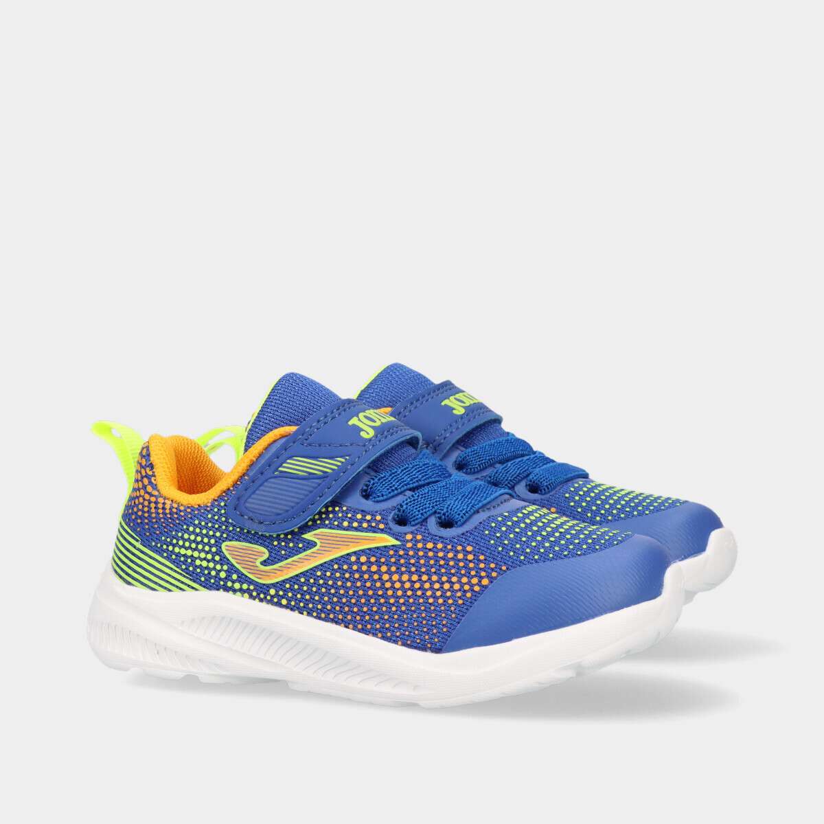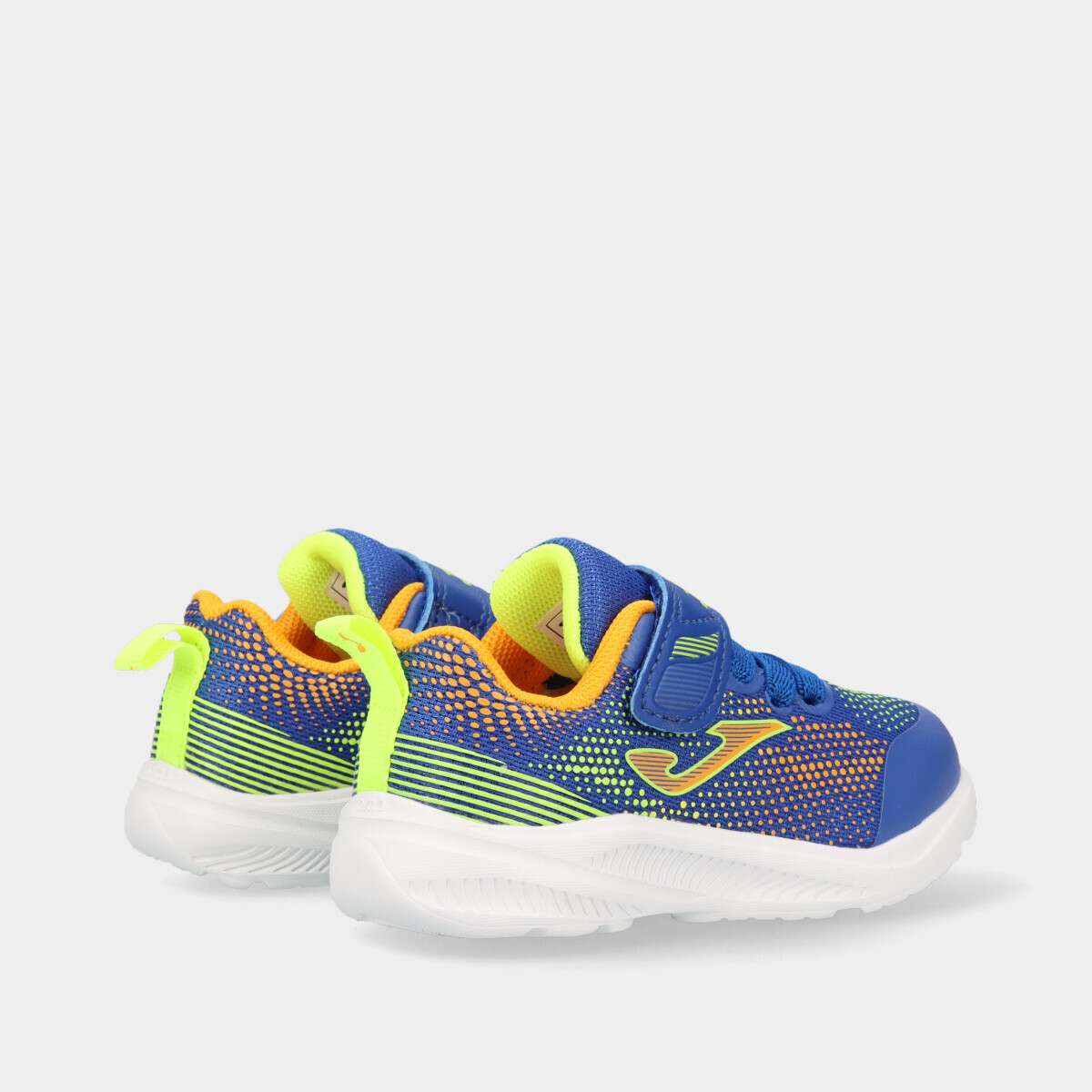 Tênis na cor azul com pormenores multicor de velcro e cordão elástico branco.
