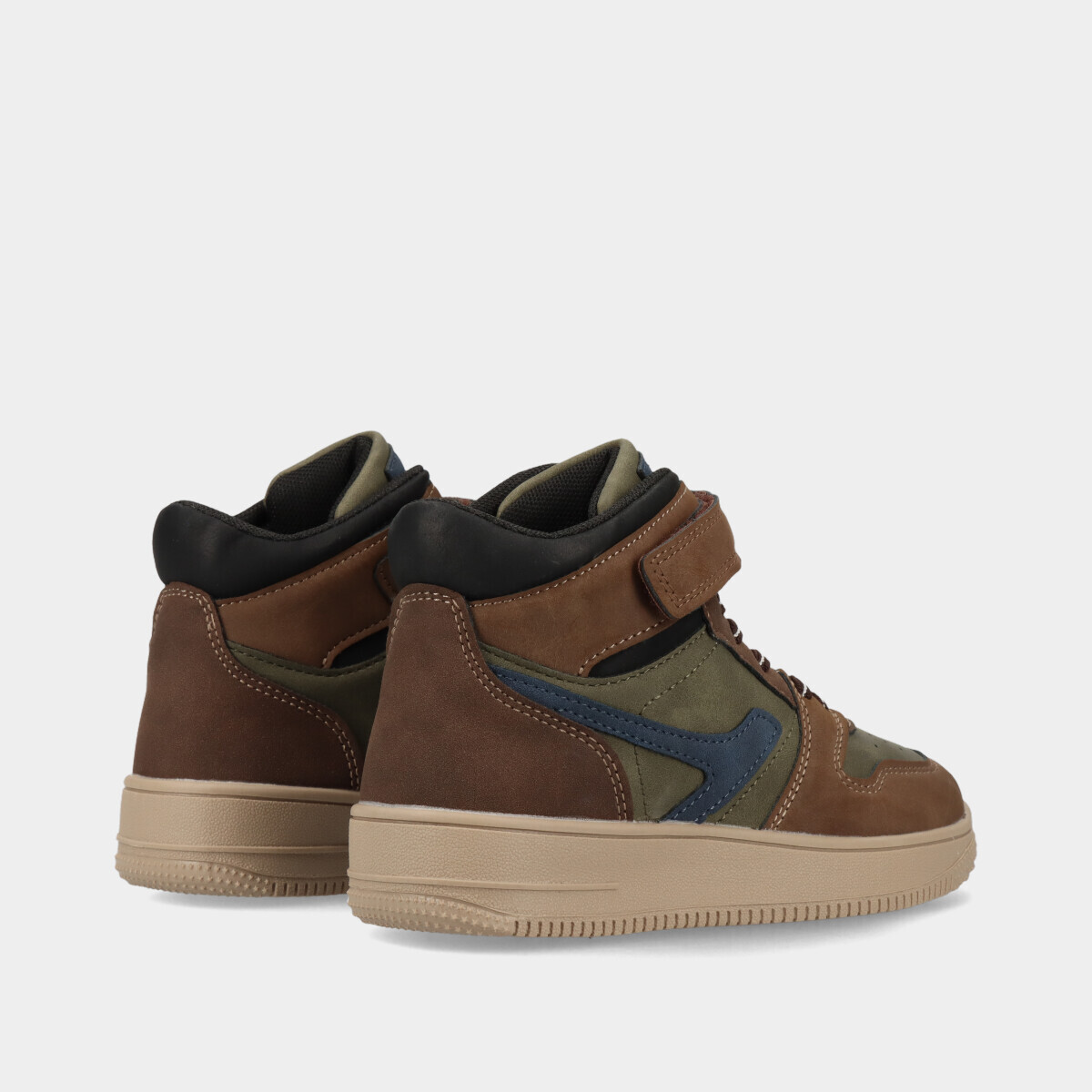 Ténis com cano para menino em castanho e cores em contraste, ideais para escola, passeios e atividades diárias, com velcro e cordão elástico para calçar facilmente.