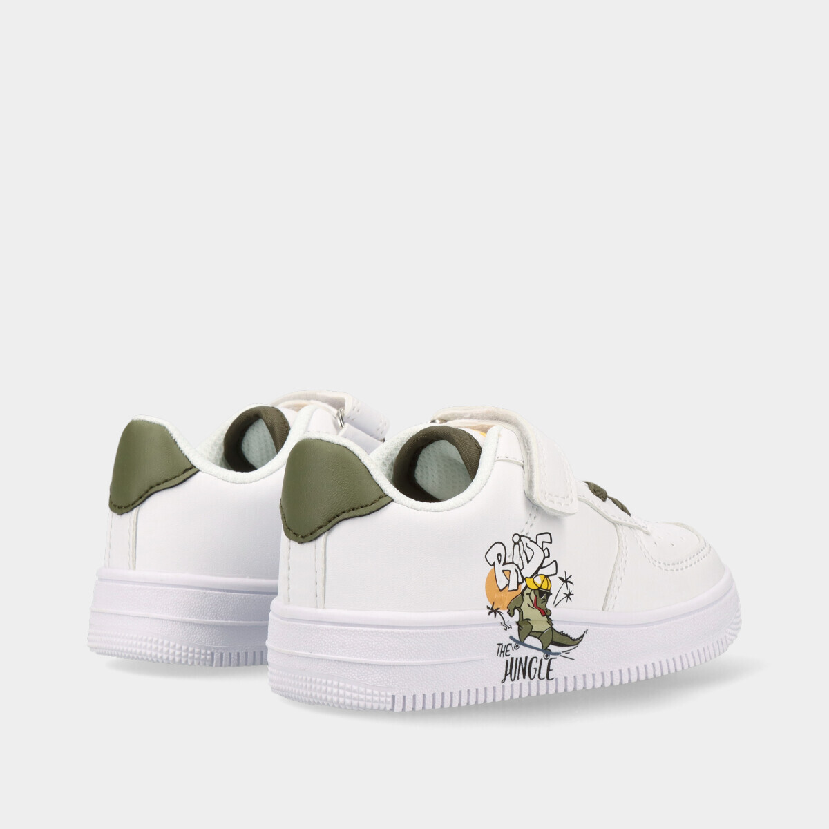 Ténis para menino em branco com pormenores em verde, ideais para escola, passeios e atividades diárias, com velcro e atacador elástico para calçar facilmente.