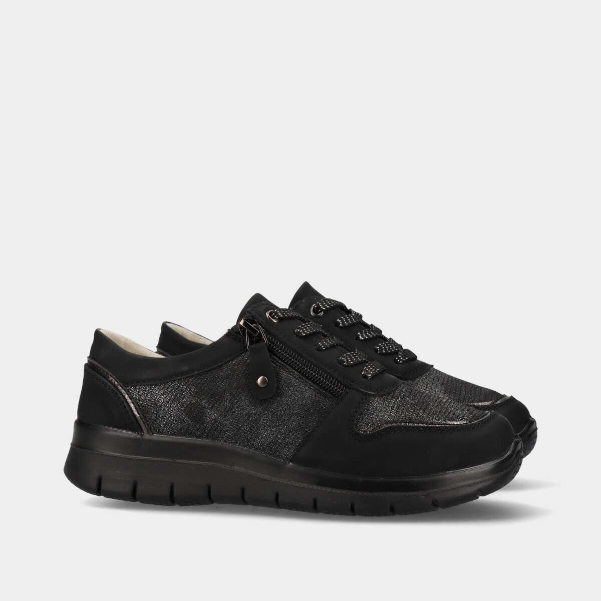 Sapatilha em preto com pormenores de brilho prateado, de cordão e fecho lateral para fácil ajuste.