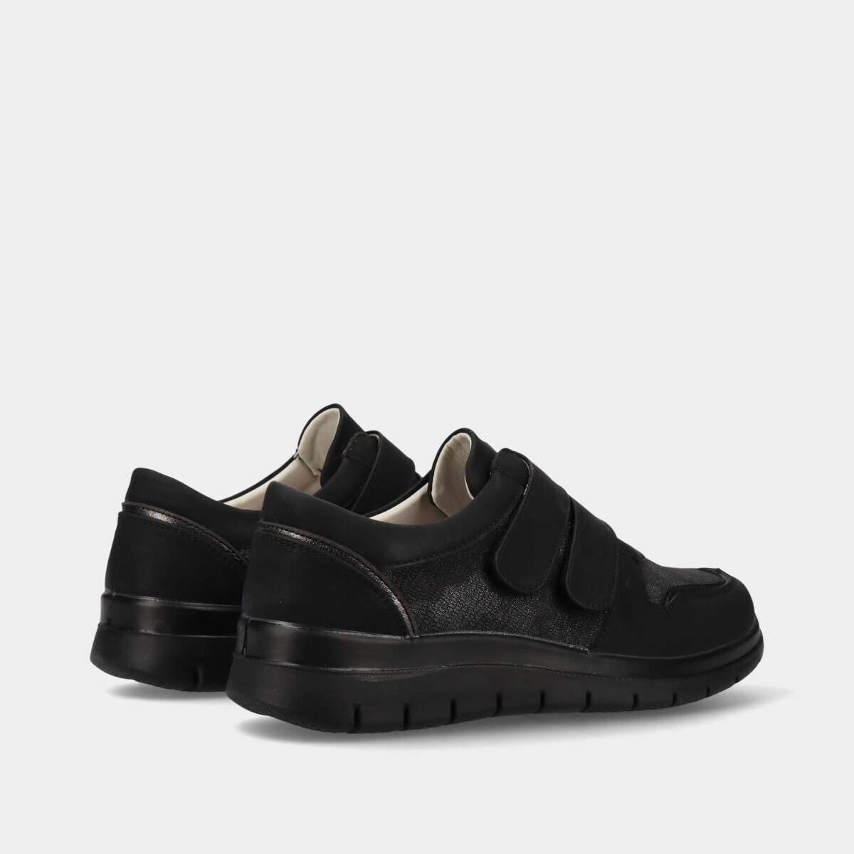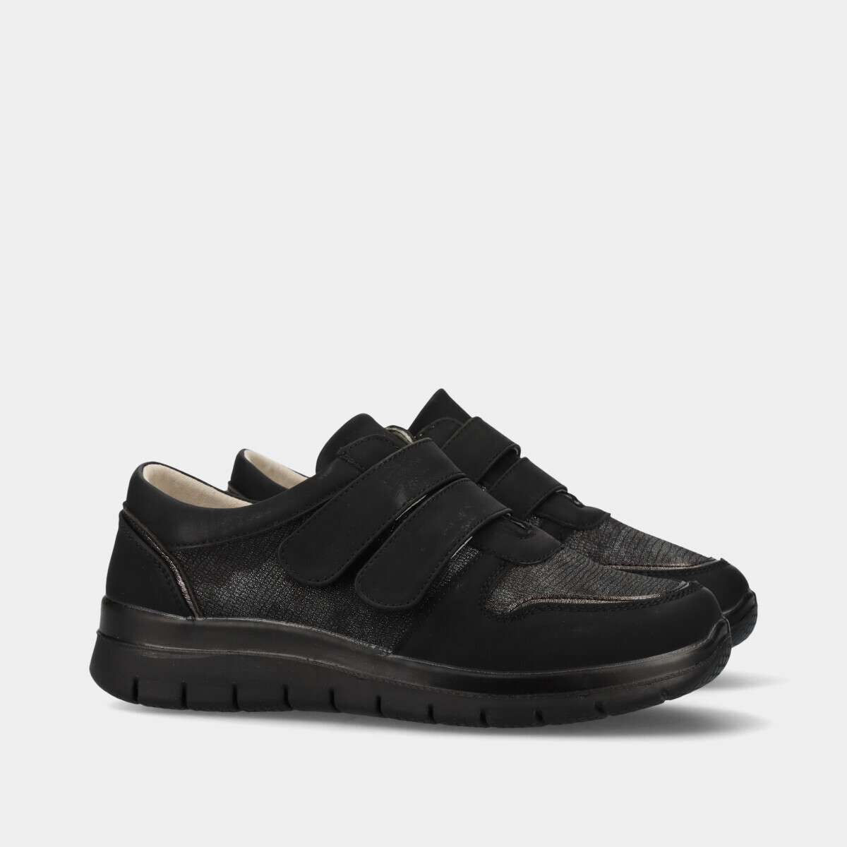 Sapatilha em preto com pormenores de brilho prateado, de dois velcros para fácil ajuste.