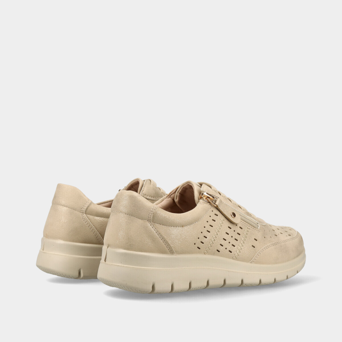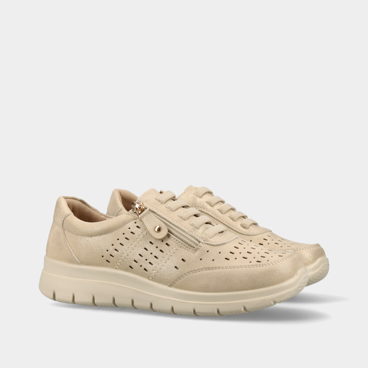 Ténis de conforto para mulher em bege, com brilho, pequena cunha, palmilha acolchoada, cordão e fecho lateral, ideais para uso diário.
