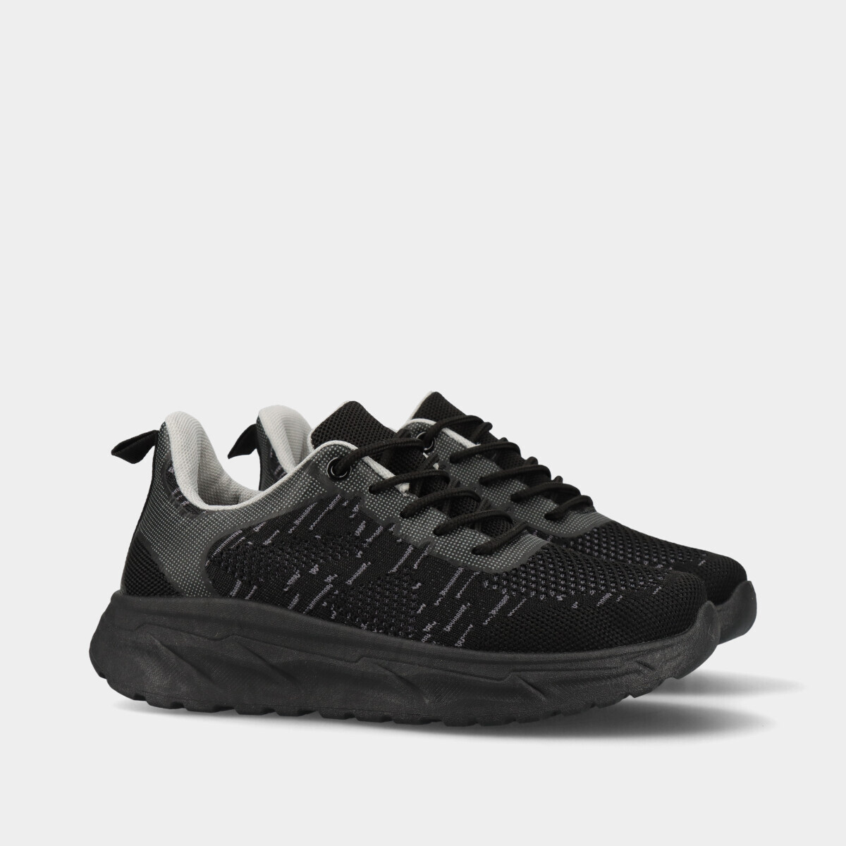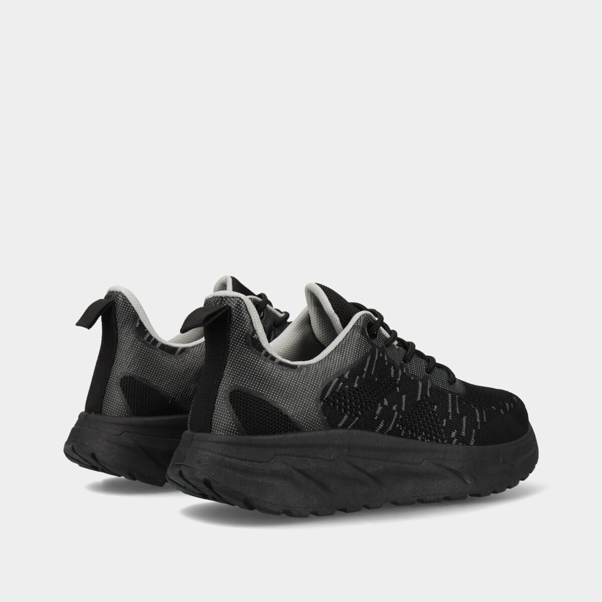 Ténis desportivos em preto e pormenores cinza, com atacadores, malha respirável e palmilha removível, ideais para desporto, ginásio, caminhadas ou uso casual.