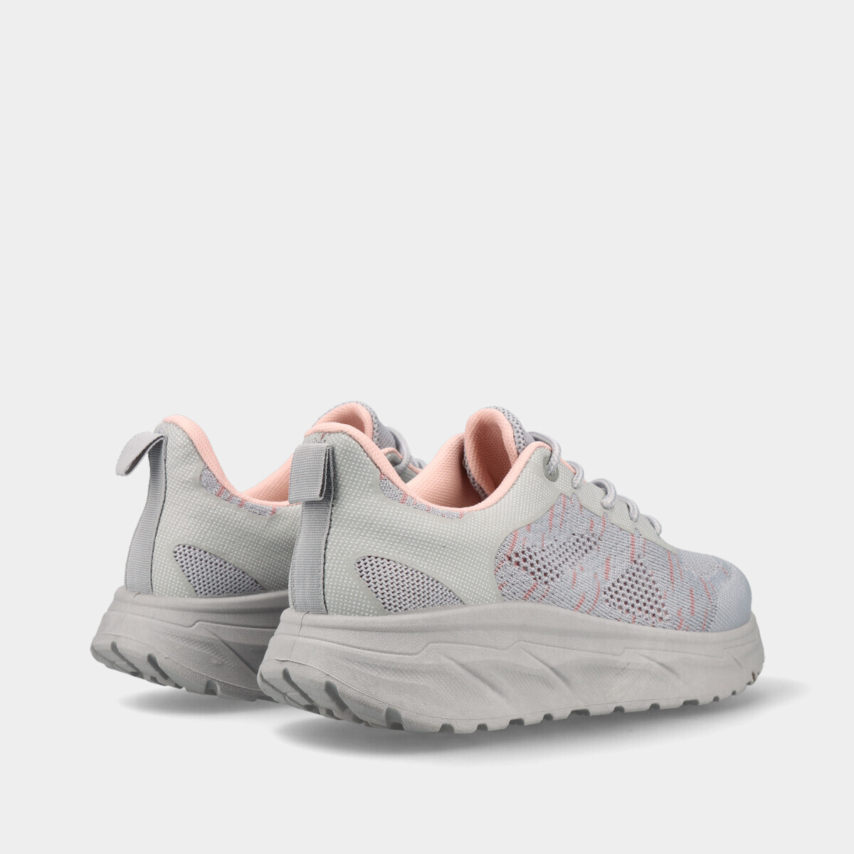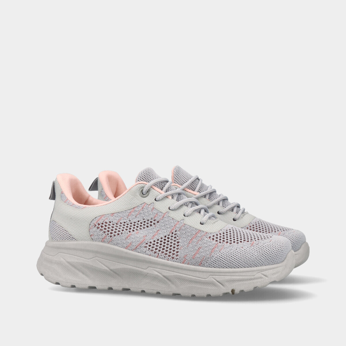 Ténis desportivos em cinza e pormenores rosa, com atacadores, malha respirável e palmilha removível, ideais para desporto, ginásio, caminhadas ou uso casual.