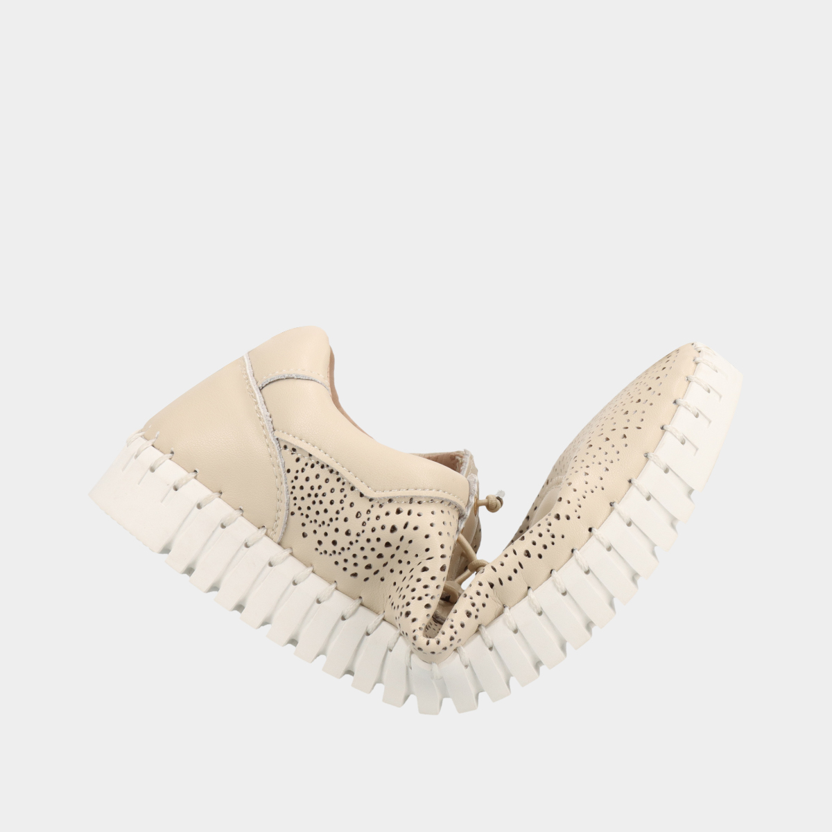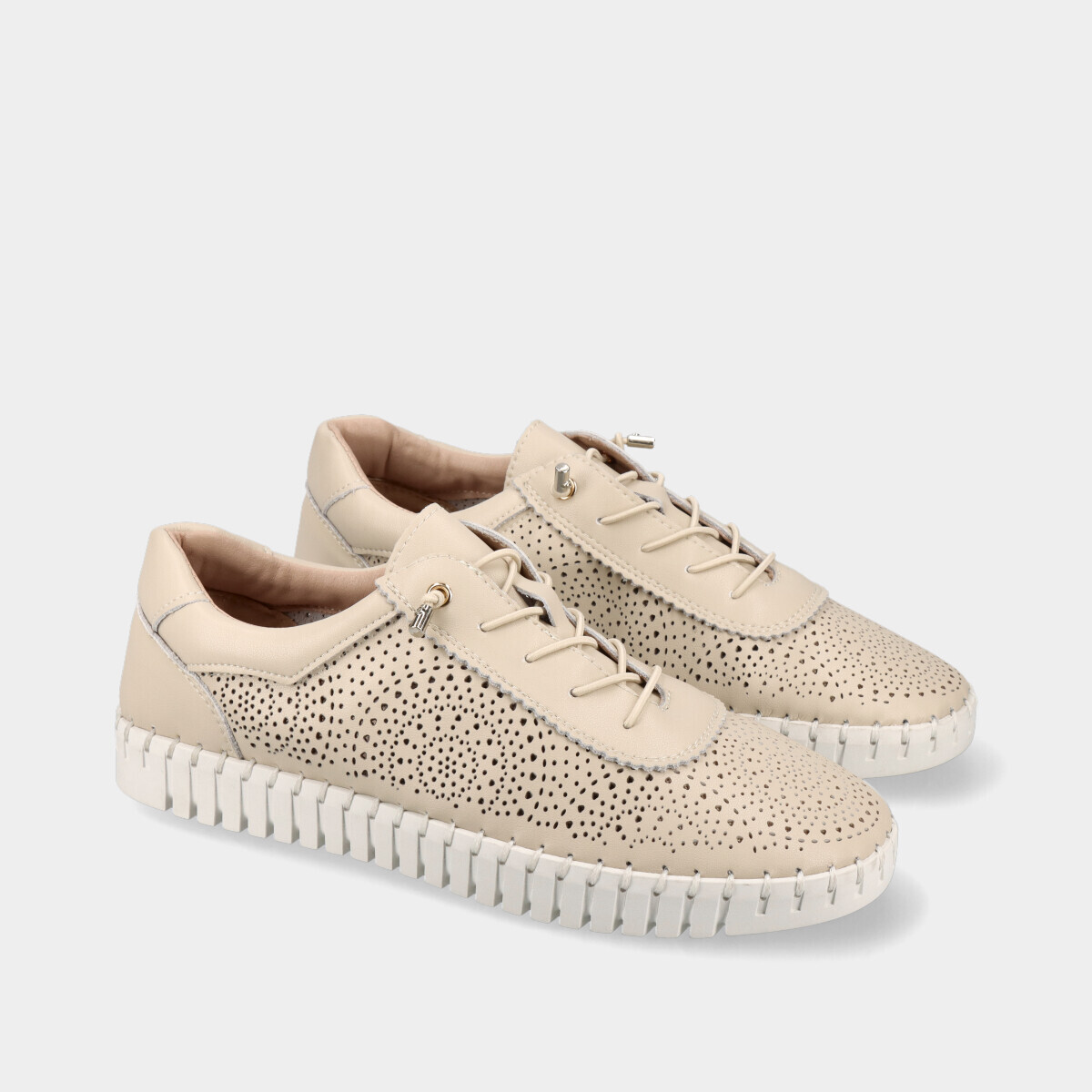 Ténis para mulher em pele bege, leves, flexíveis e confortáveis, com perfurações que mantêm o pé fresco e palmilha acolchoada em pele para maior conforto ao caminhar. Ténis femininos fáceis de calçar, com elástico, versáteis e ideais para o dia a dia, passeios urbanos ou looks casuais, oferecendo estilo, frescura e conforto máximo.