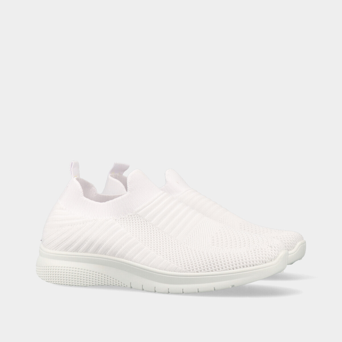 Ténis slip-on para mulher em malha respirável branca, com palmilha removível e confortável, fácil de calçar e ideal para uso casual.