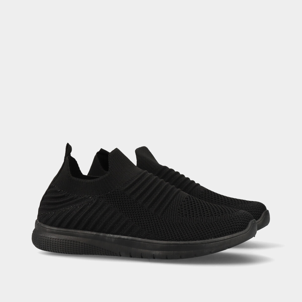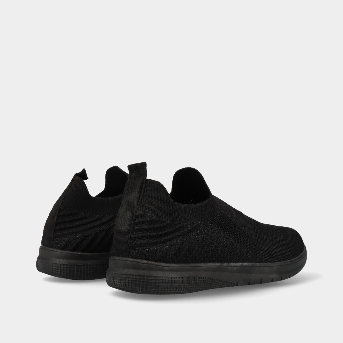 Ténis slip-on para mulher em malha respirável preta, com palmilha removível e confortável, fácil de calçar e ideal para uso casual.