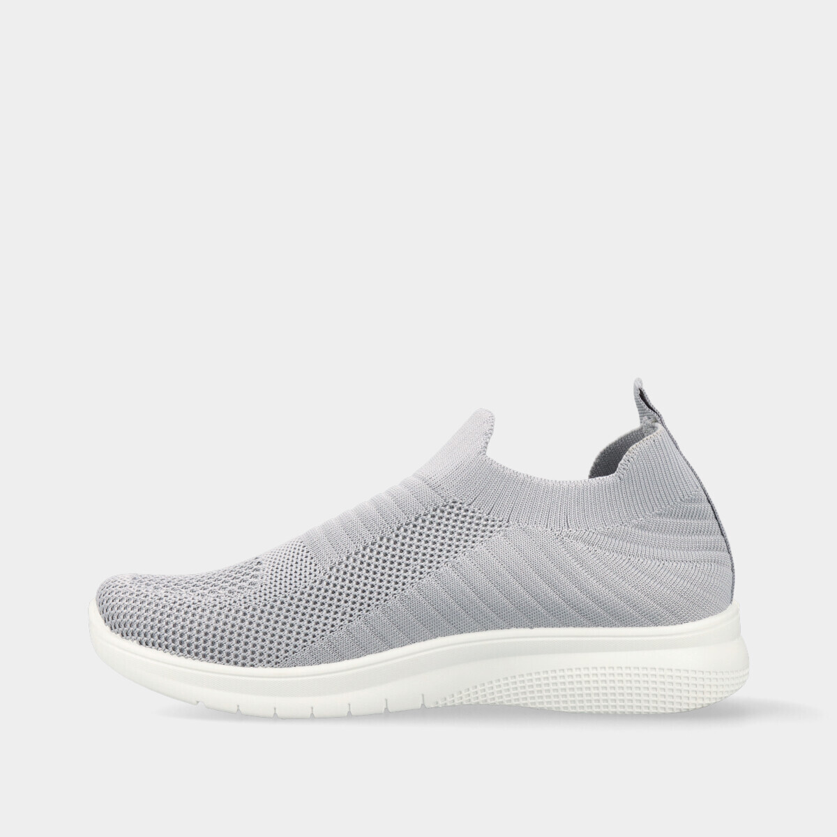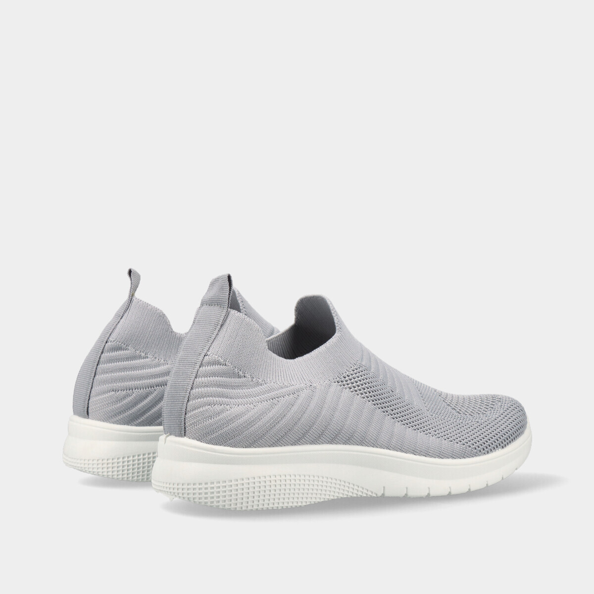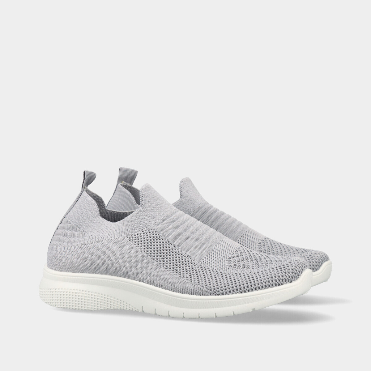Ténis slip-on para mulher em malha respirável cinza, com palmilha removível e confortável, fácil de calçar e ideal para uso casual.