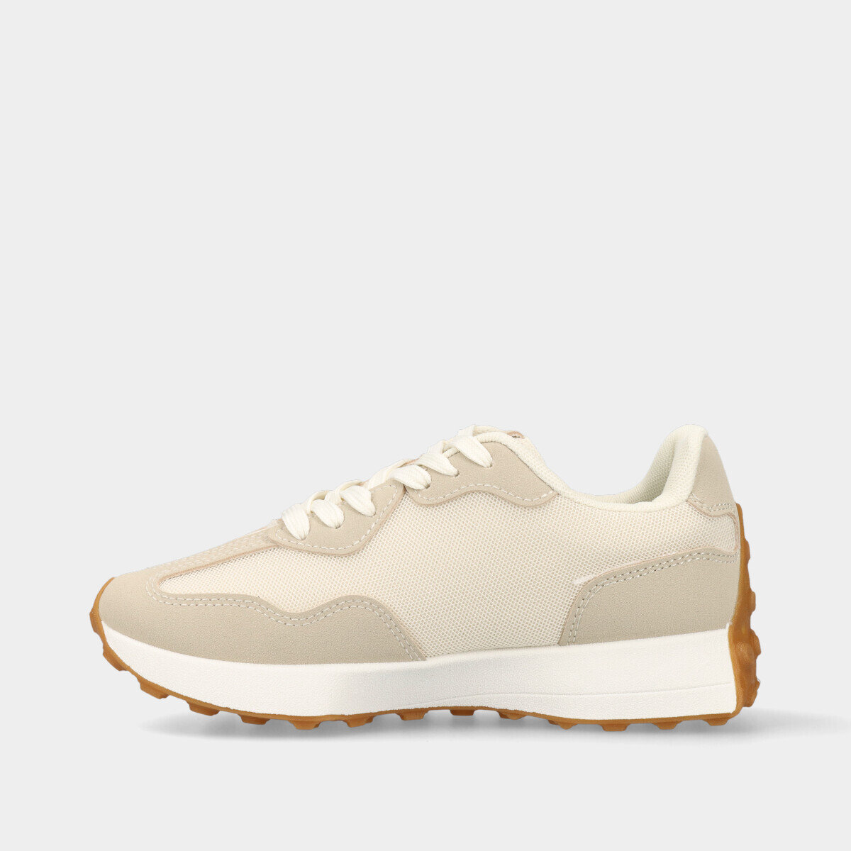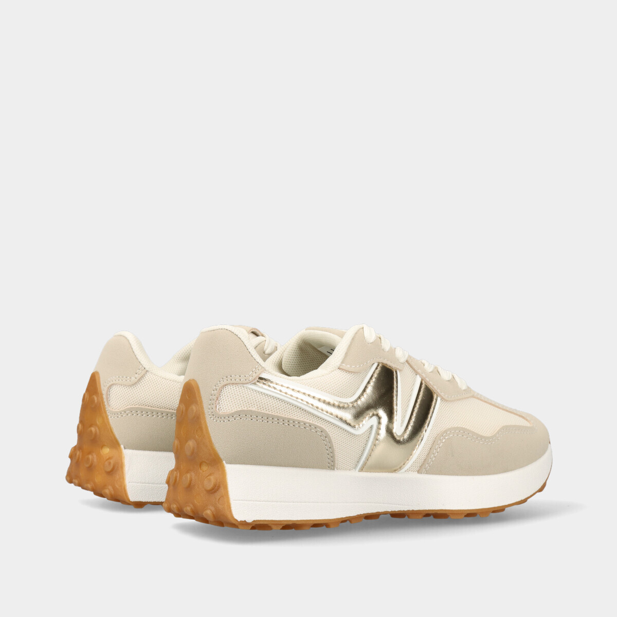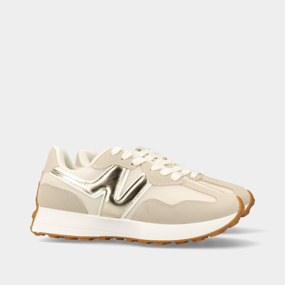 Ténis para mulher em bege com pormenor dourado, atacadores, forro confortável e sola robusta. Perfeitos para looks elegantes e práticos.