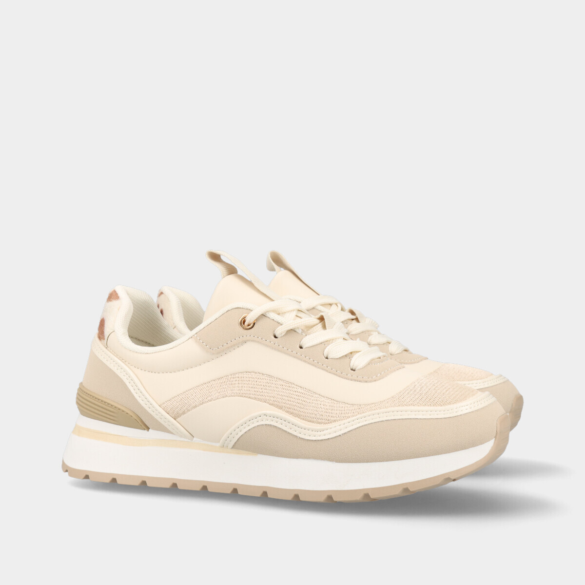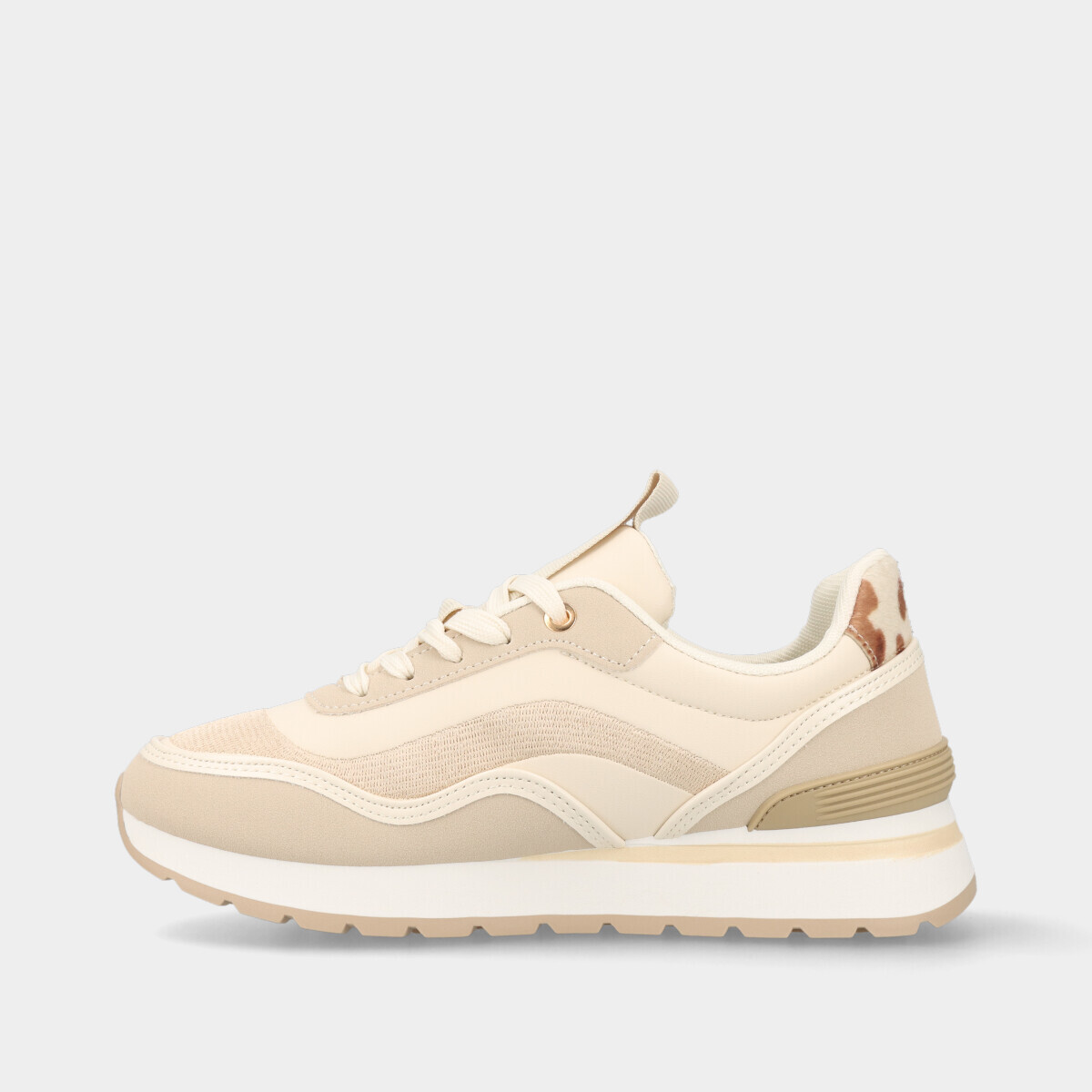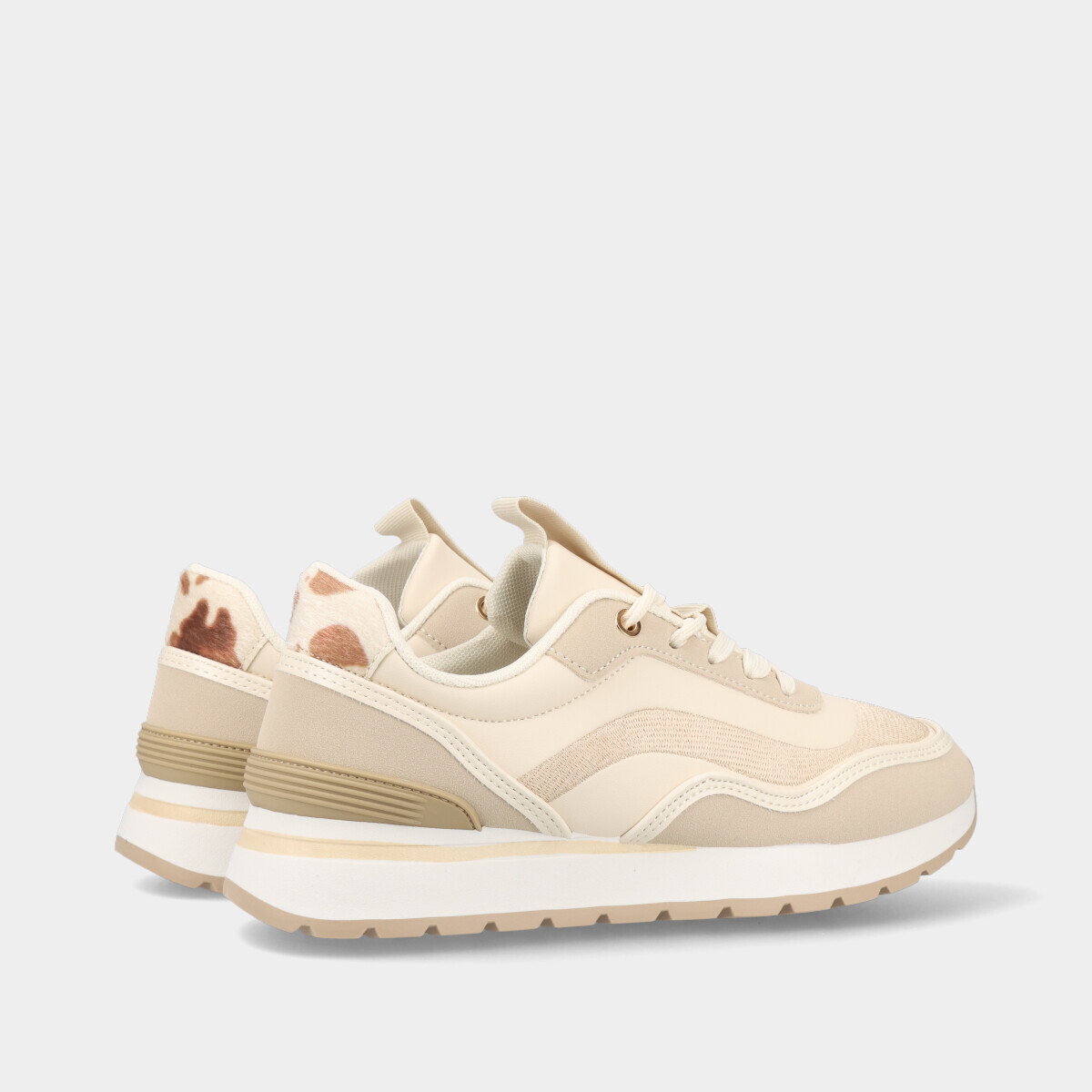Sapatilha casual em tons bege com detalhe animal print no calcanhar. Moderna, leve e confortável para o dia a dia.