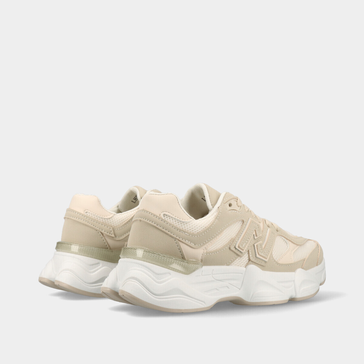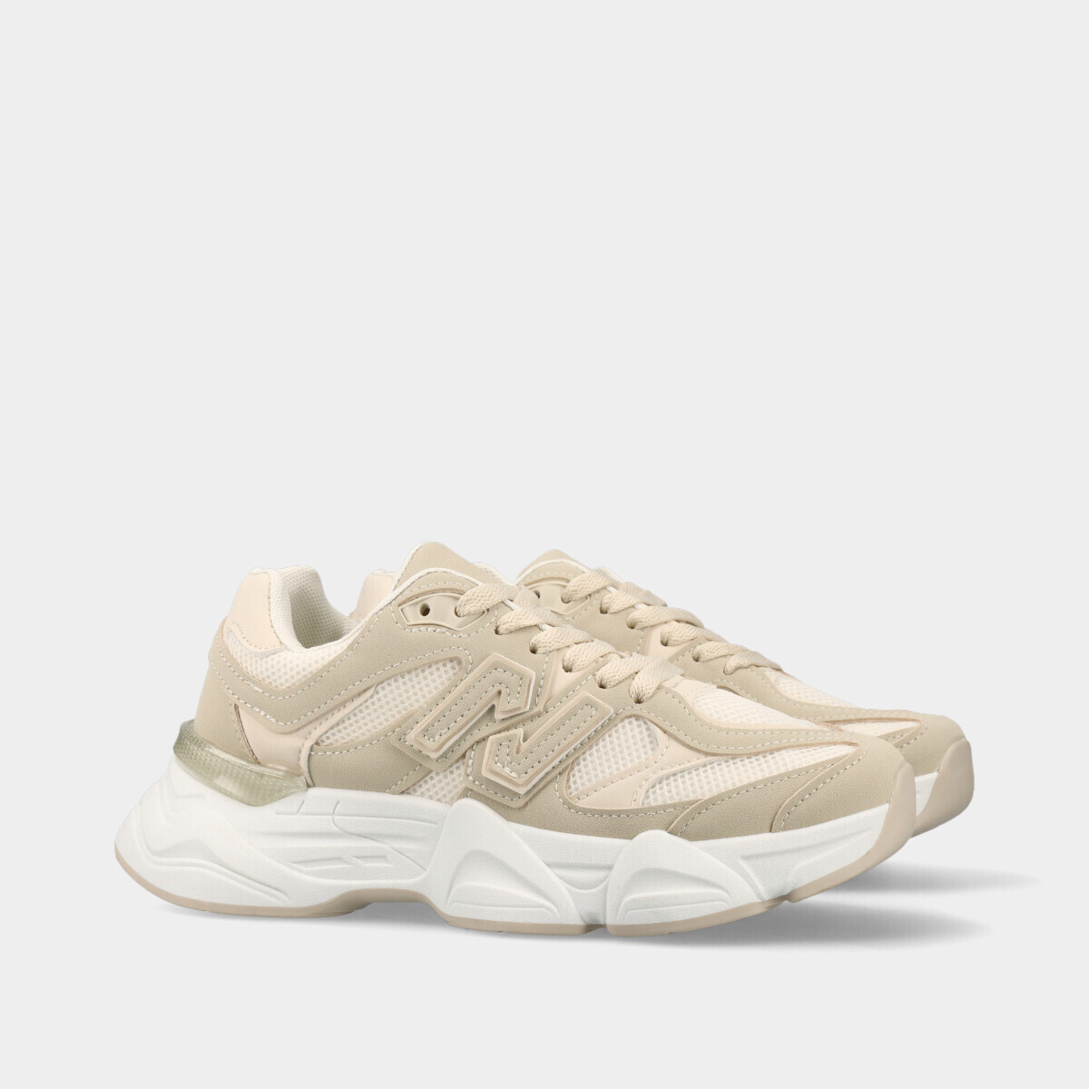 Ténis desportivos para mulher em bege, com atacadores, malha respirável e palmilha removível, ideais para desporto, ginásio, caminhadas ou uso casual.