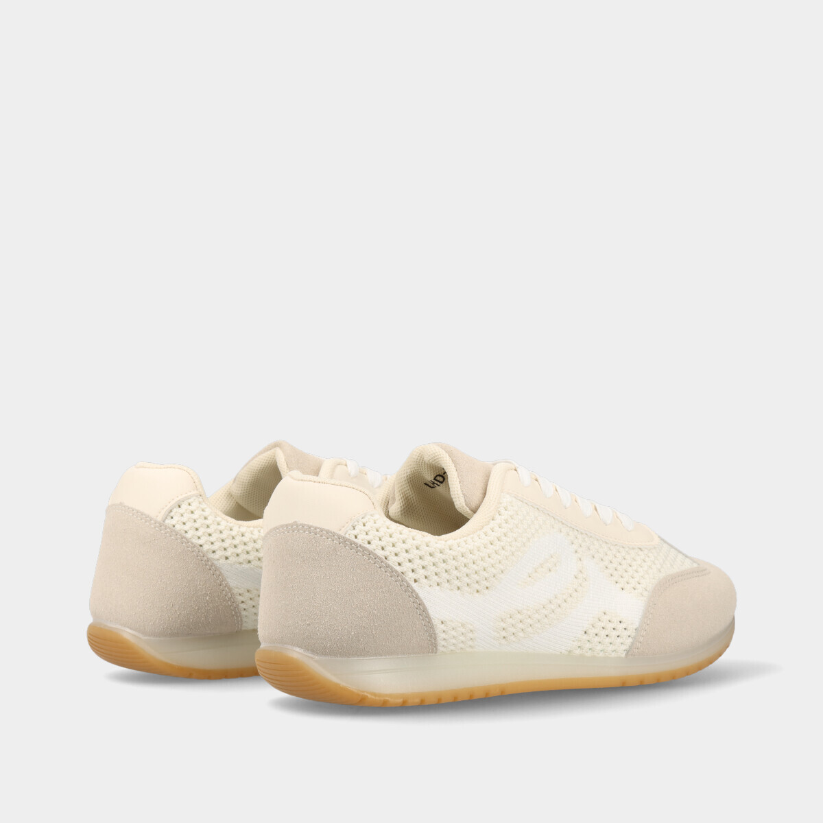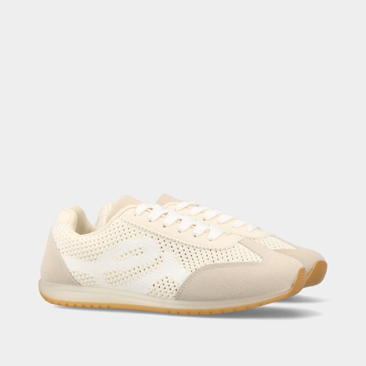 Ténis para mulher em bege, com laterais em rede mesh, atacadores, forro confortável e sola de borracha. Perfeitos para looks elegantes e práticos.