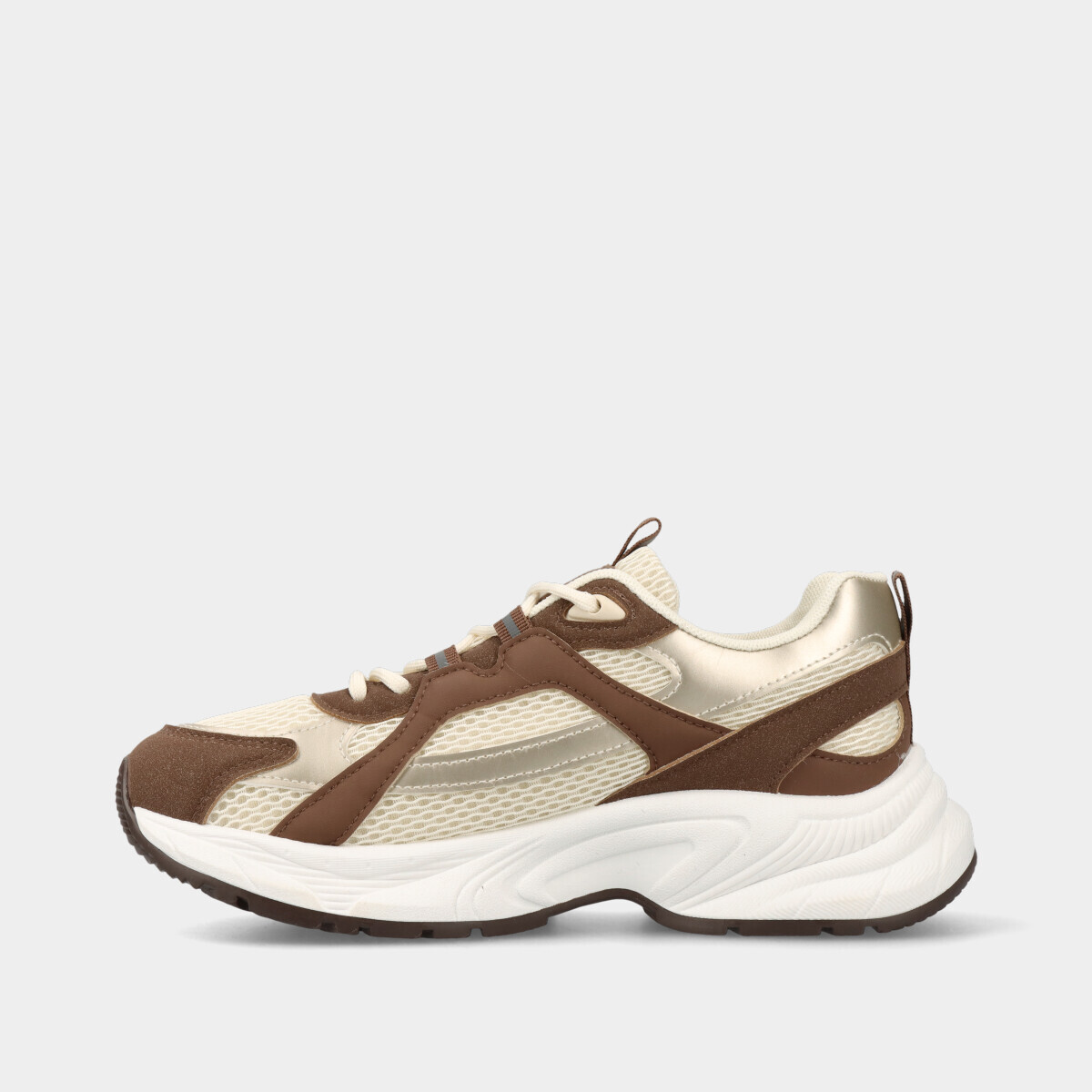 Ténis desportivos para mulher em castanho, com atacadores, malha respirável e palmilha removível, ideais para desporto, ginásio, caminhadas ou uso casual.
