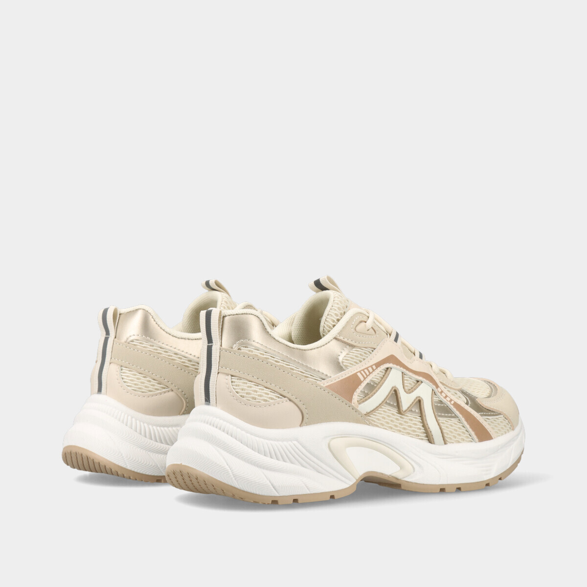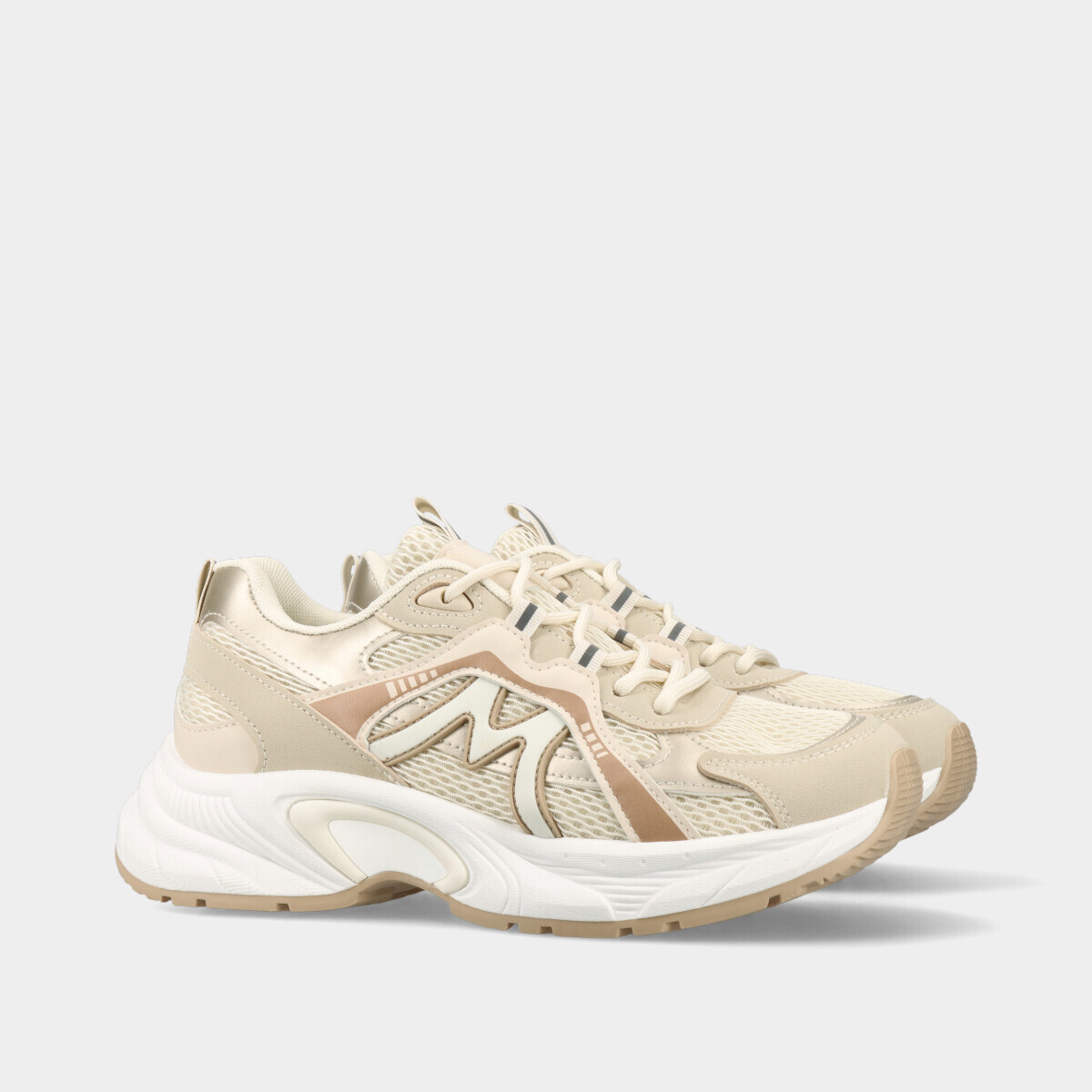 Ténis desportivos para mulher em bege, com atacadores, malha respirável e palmilha removível, ideais para desporto, ginásio, caminhadas ou uso casual.