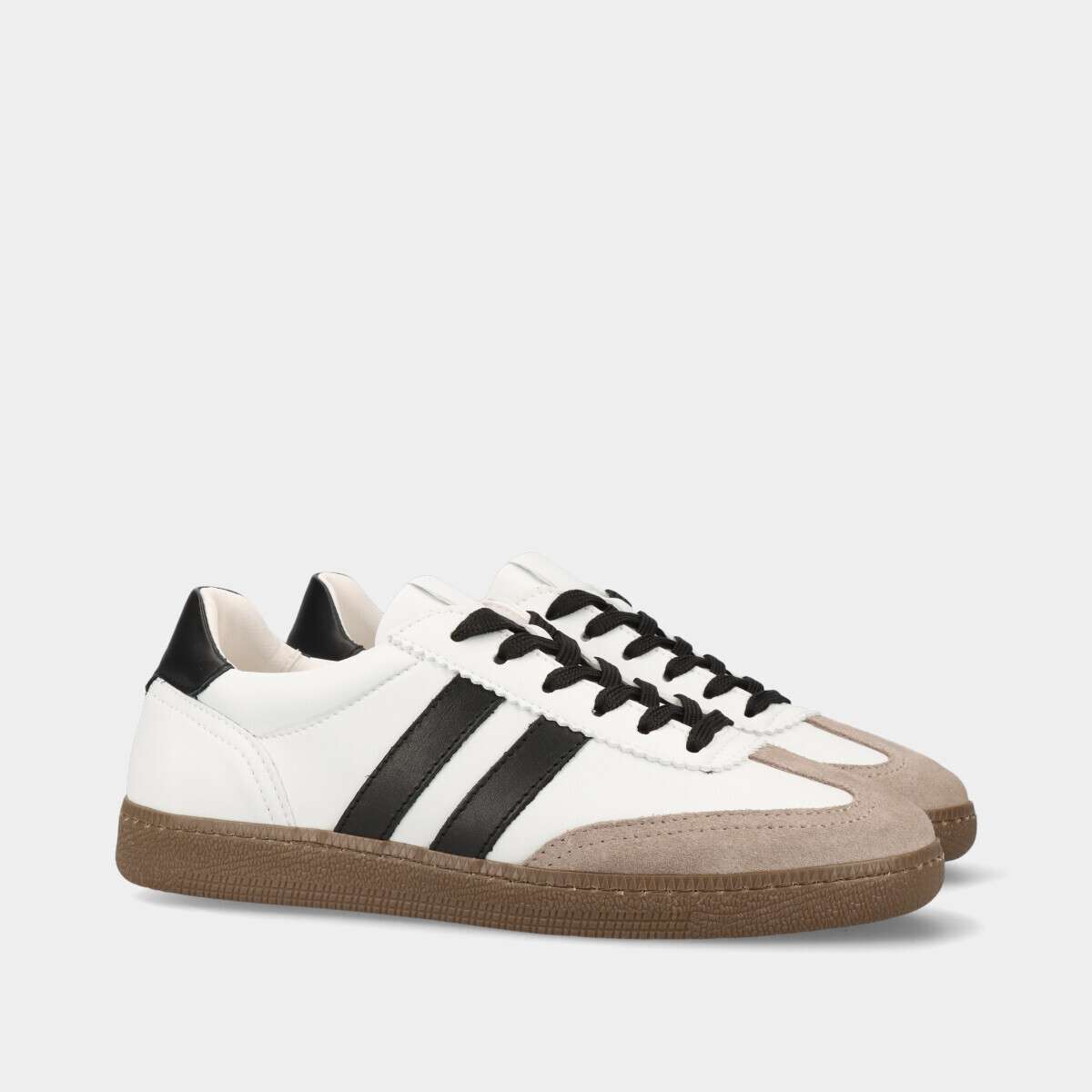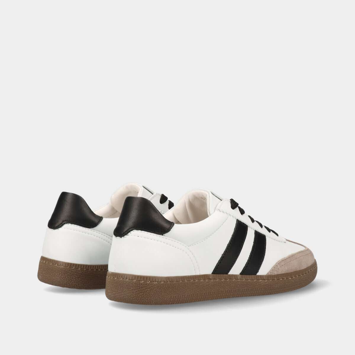 Sapatilha em pele com duas riscas laterais em contraste e palmilha removível.