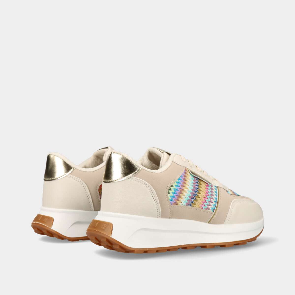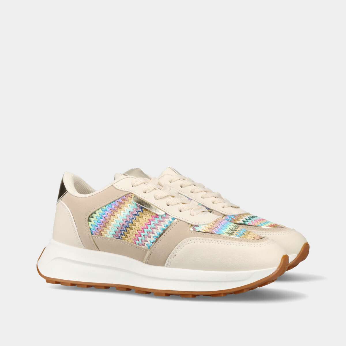 Tênis feminino na cor bege com ráfia multicor e acabamentos metálicos discretos em dourado, de sola robusta e cordão.