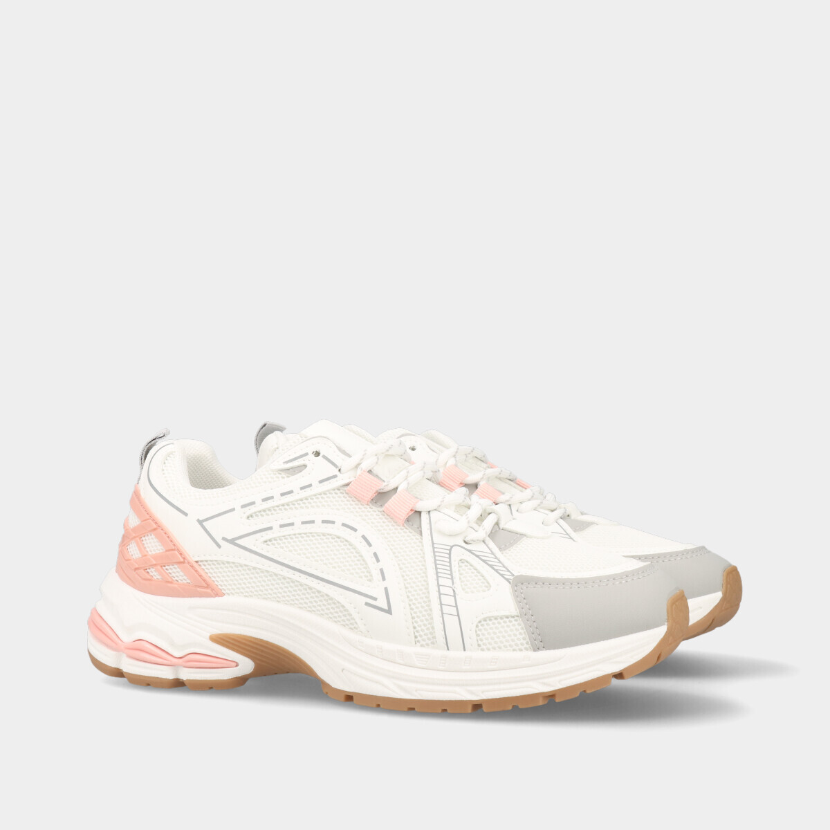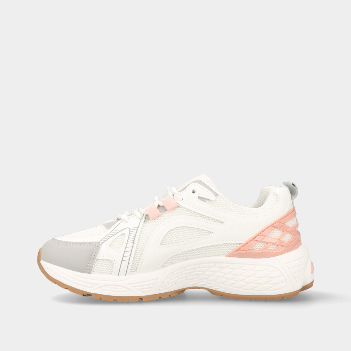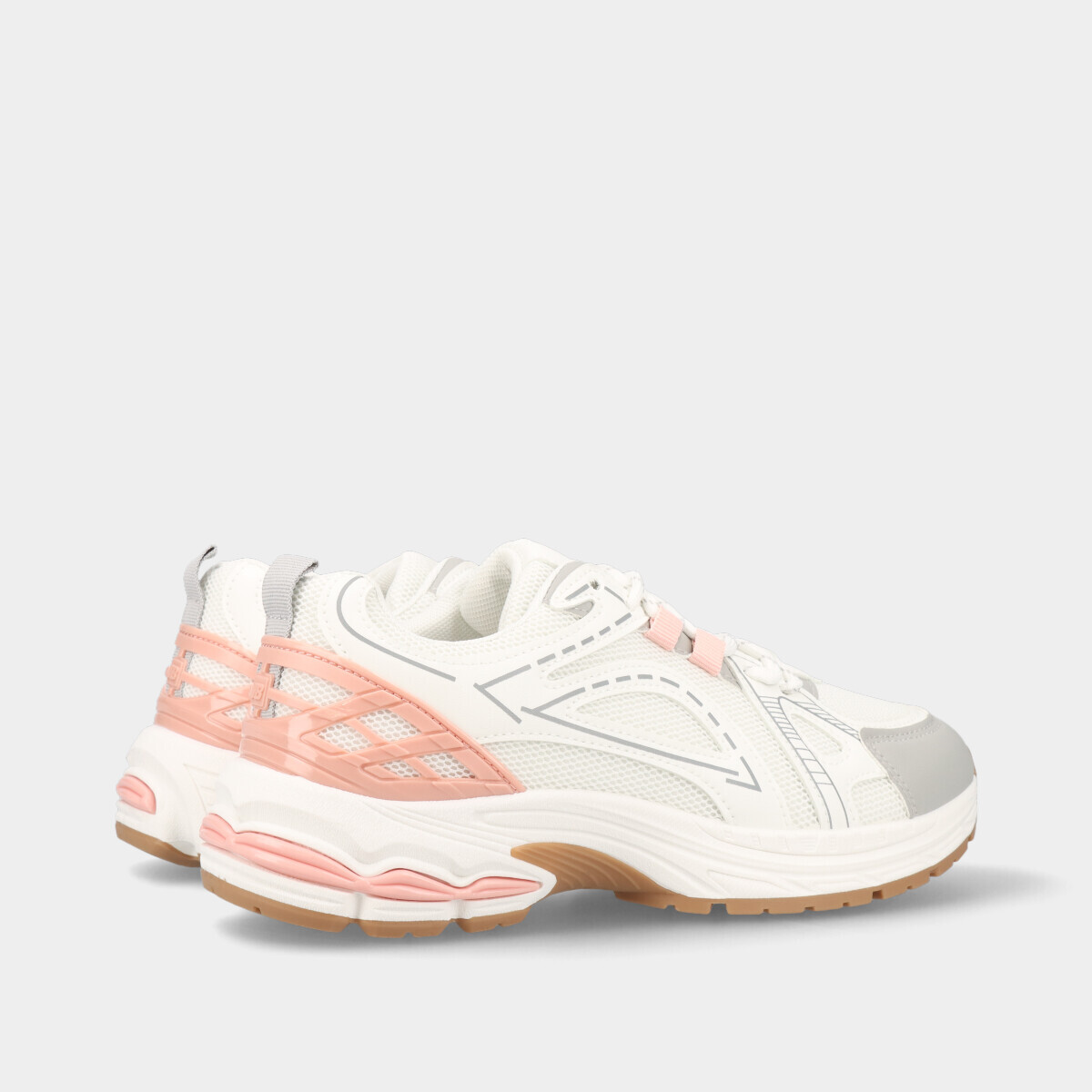 Ténis desportivos para mulher em branco, rosa e cinza, com atacadores, malha respirável e palmilha removível, ideais para desporto, ginásio, caminhadas ou uso casual.