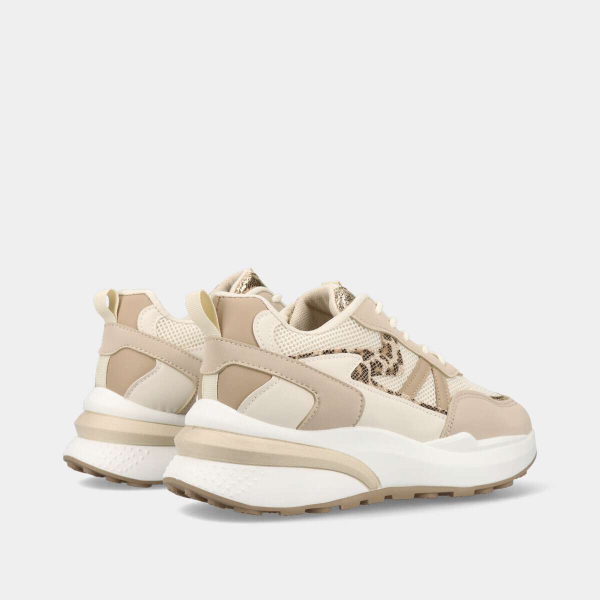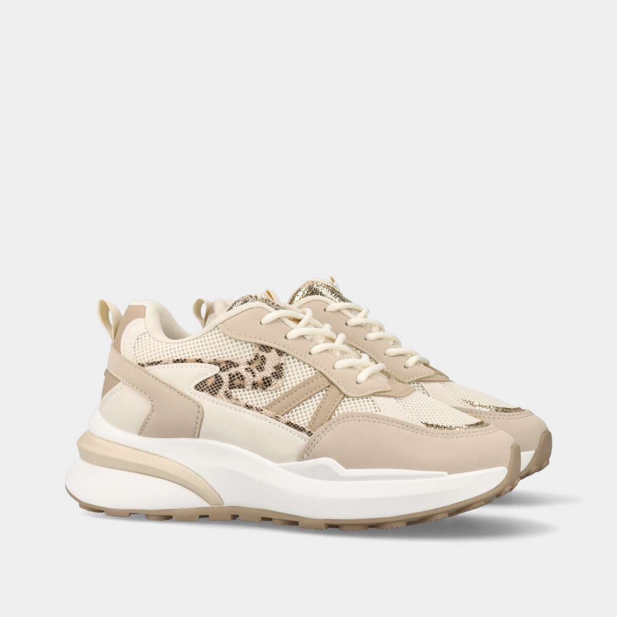 Tênis feminino bege com detalhes em padrão animal print leopardo e aplicações brilhantes, de cordão.