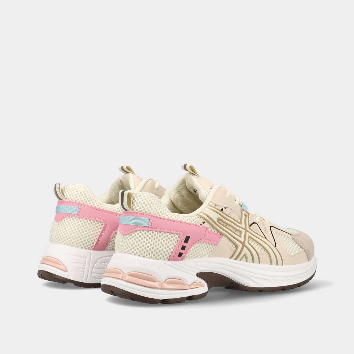 Tênis desportivo na cor bege com detalhes multicoloridos, de cordão.