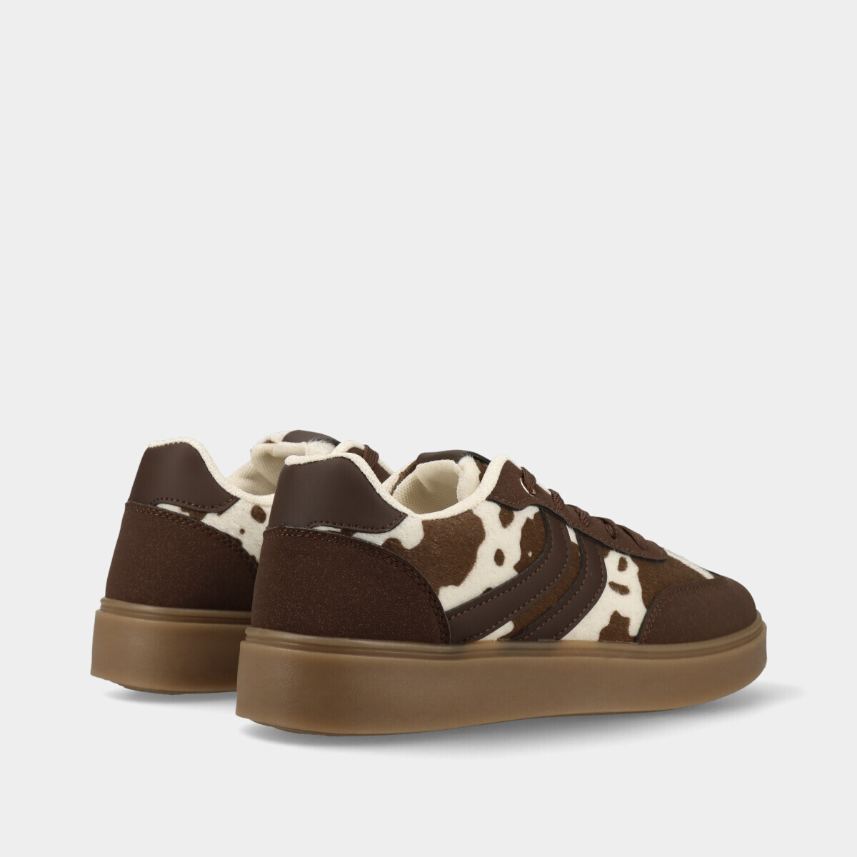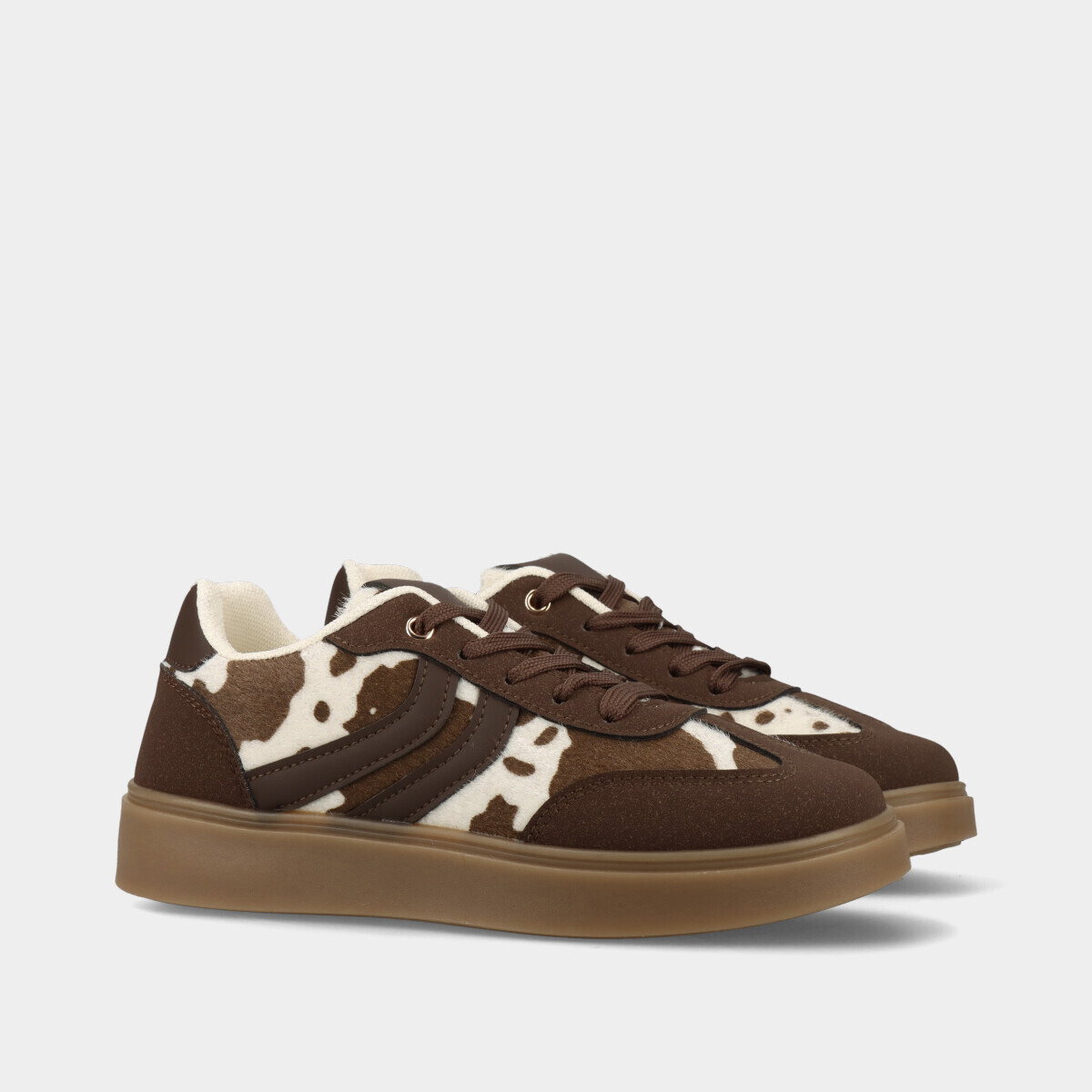 Ténis para mulher em castanho com pormenores animal print, atacadores, forro confortável e sola de borracha. Perfeitos para looks práticos e elegantes.