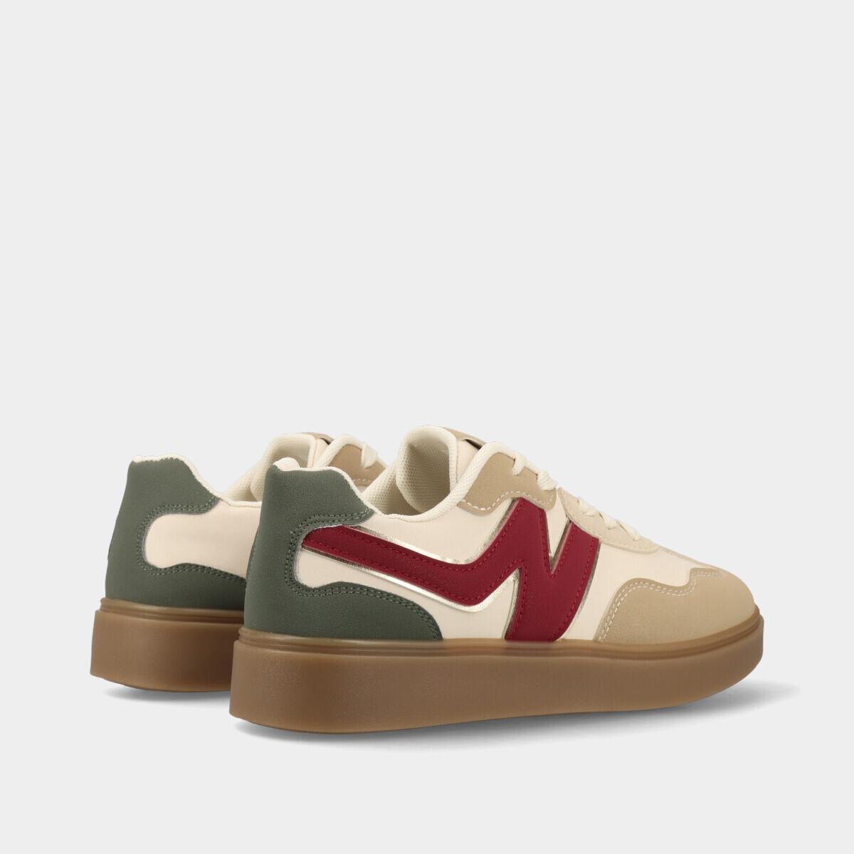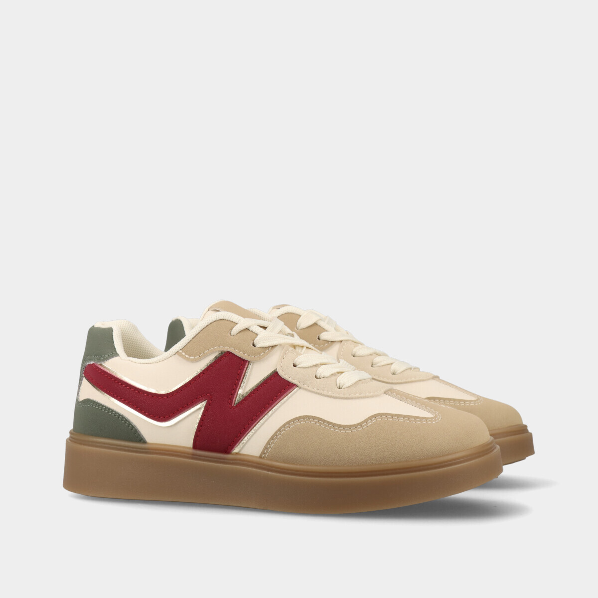 Ténis para mulher em bege e bordô, com atacadores, forro confortável e sola de borracha. Perfeitos para looks práticos e elegantes.