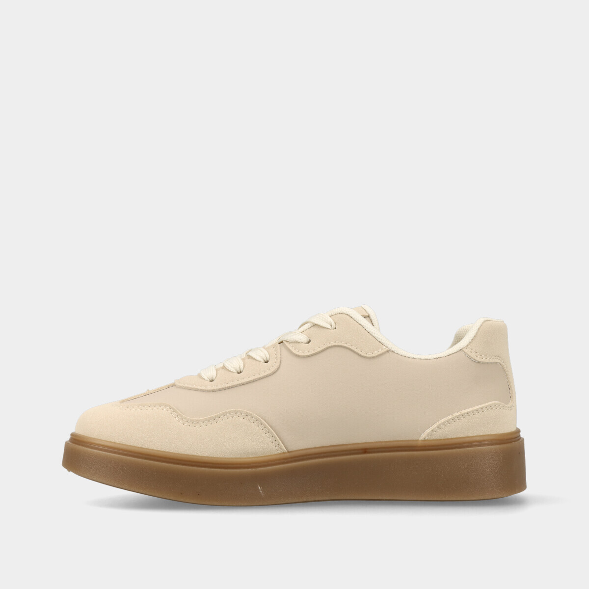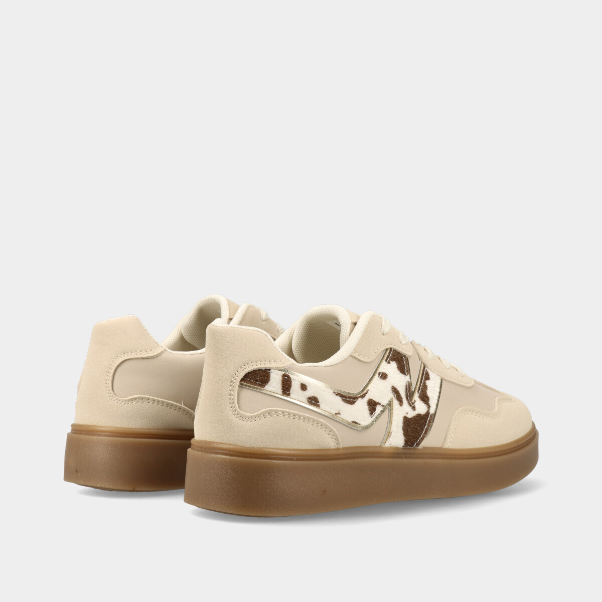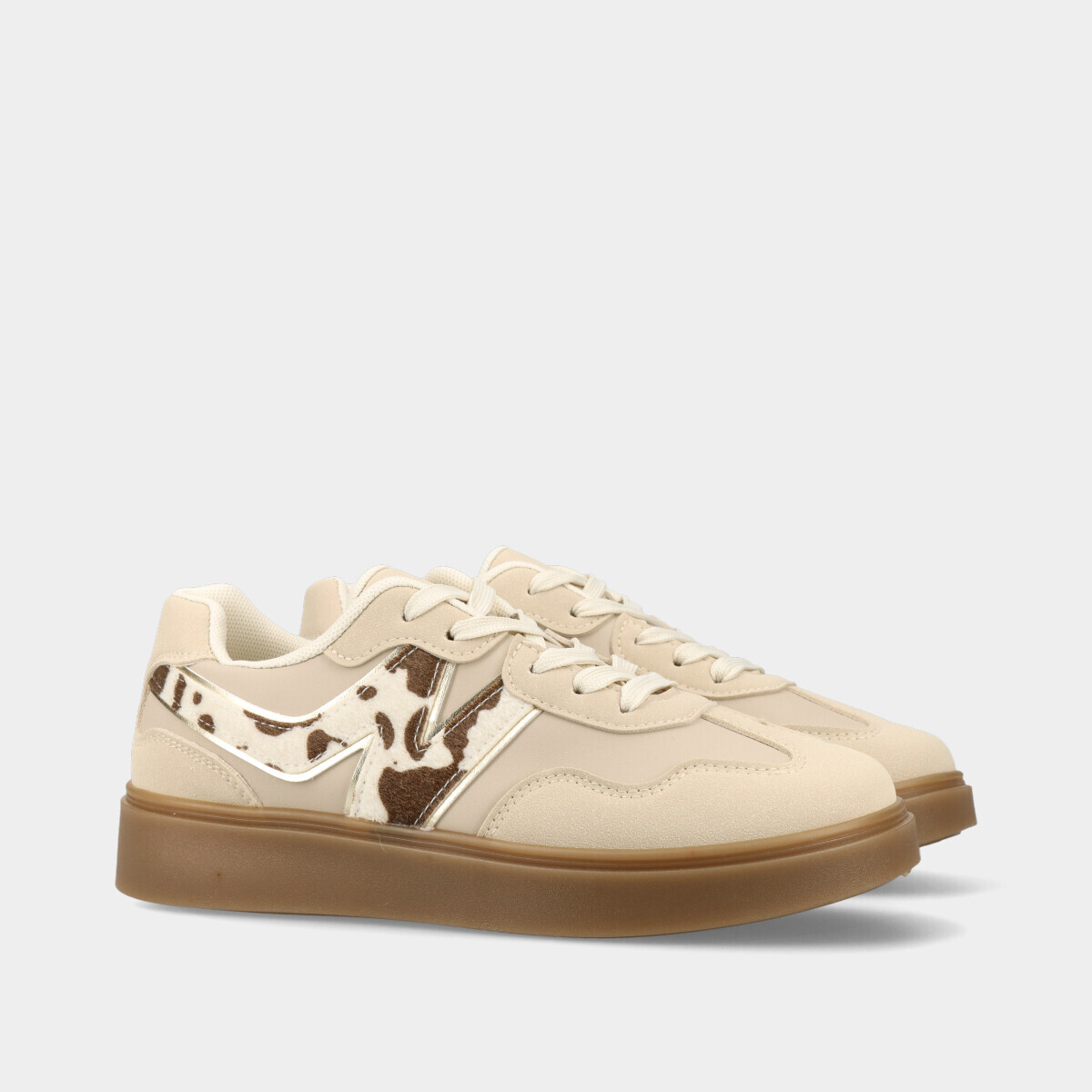 Ténis para mulher em bege com pormenor animal print, atacadores, forro confortável e sola de borracha. Perfeitos para looks práticos e elegantes.