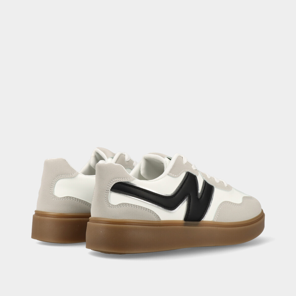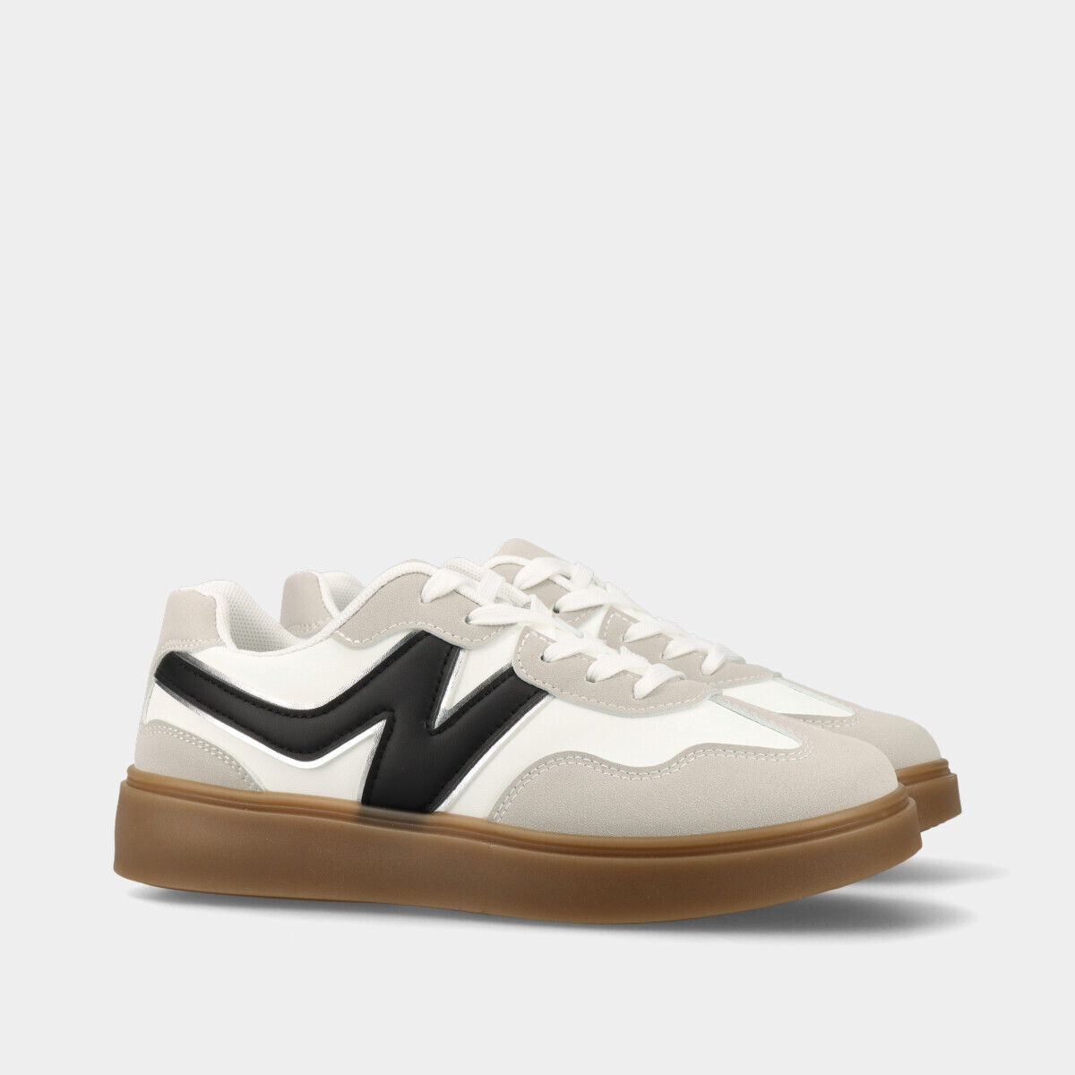 Ténis para mulher em branco, cinza e preto, com atacadores, forro confortável e sola de borracha. Perfeitos para looks práticos e elegantes.