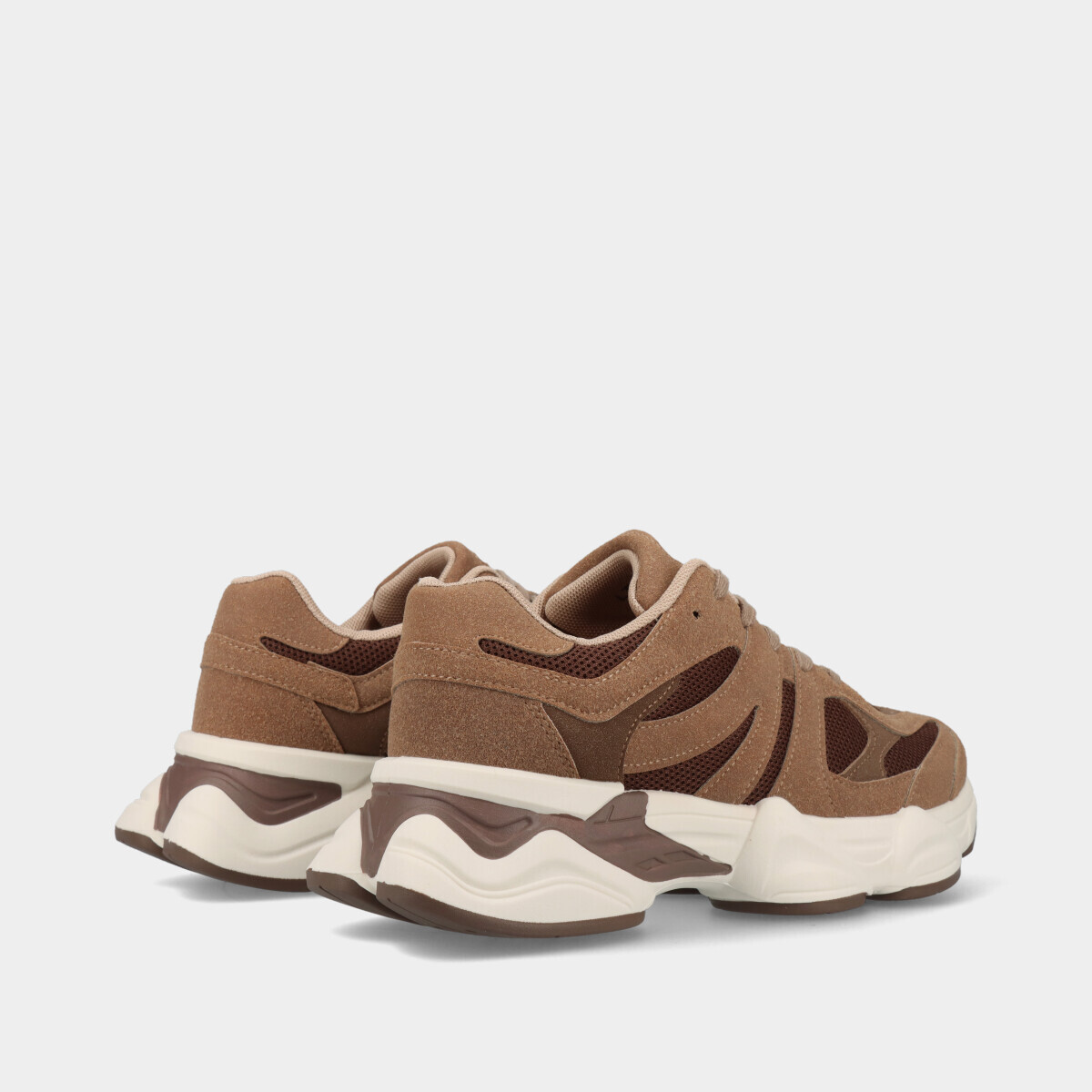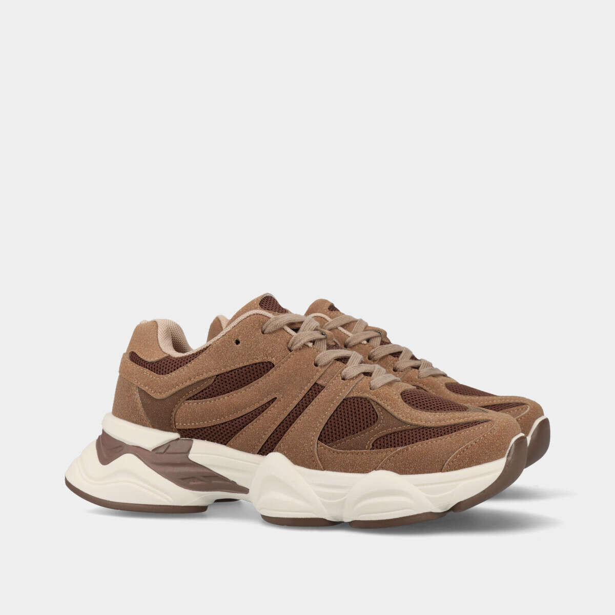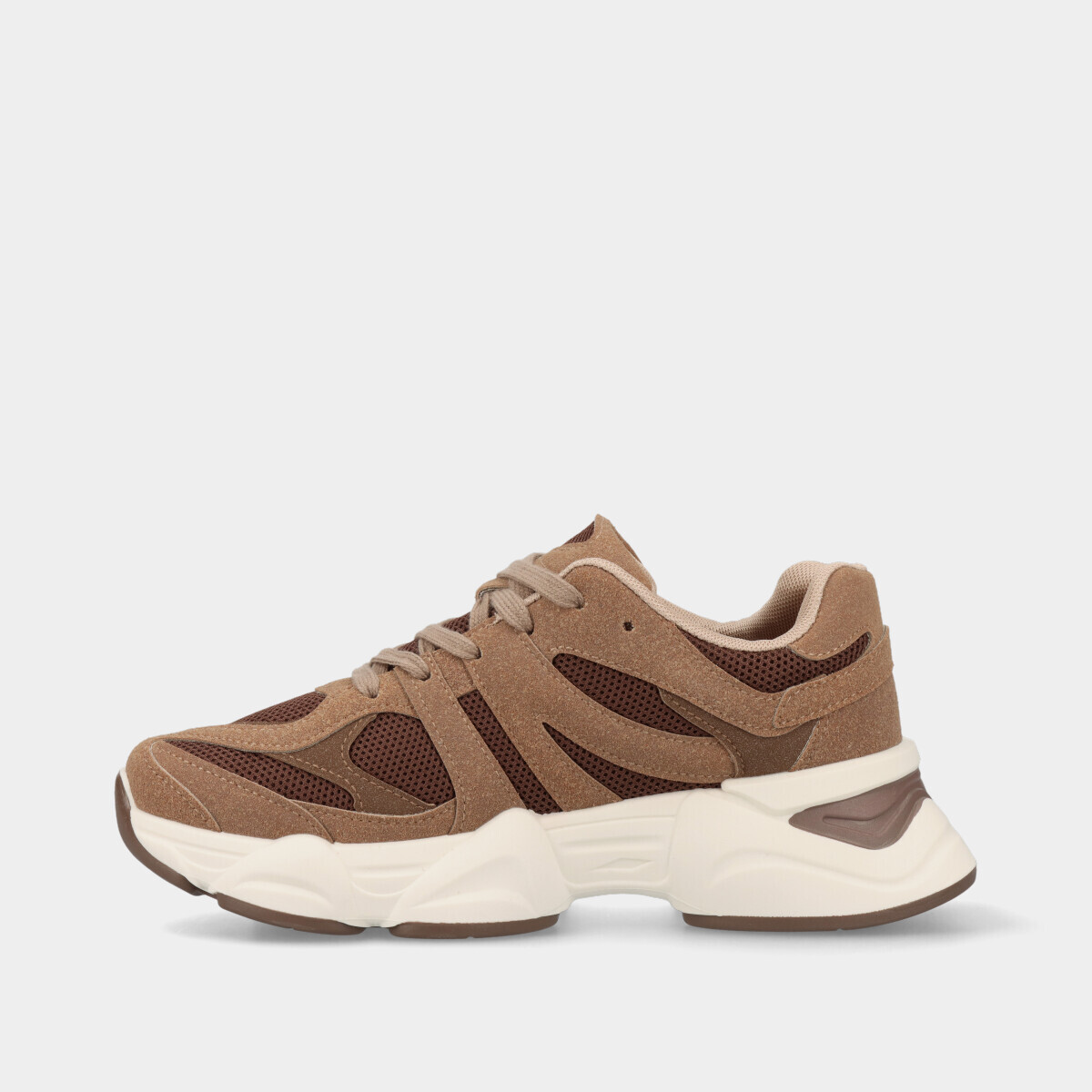 Ténis desportivos para mulher em castanho, com atacadores, malha respirável e palmilha removível de espuma, ideais para desporto, ginásio, caminhadas ou uso casual.