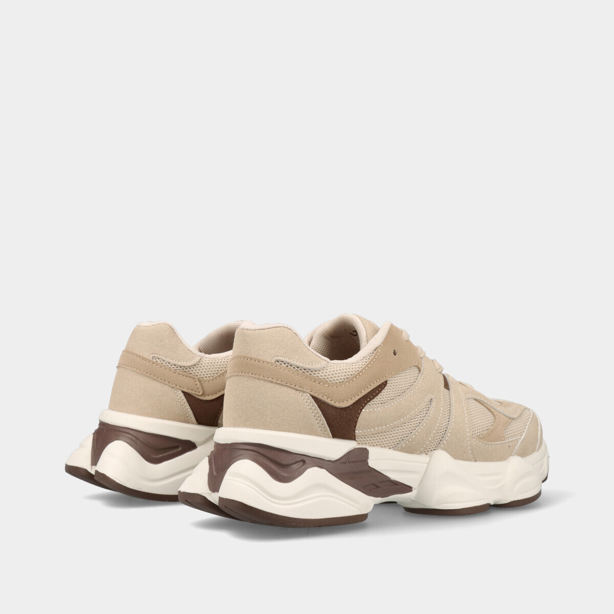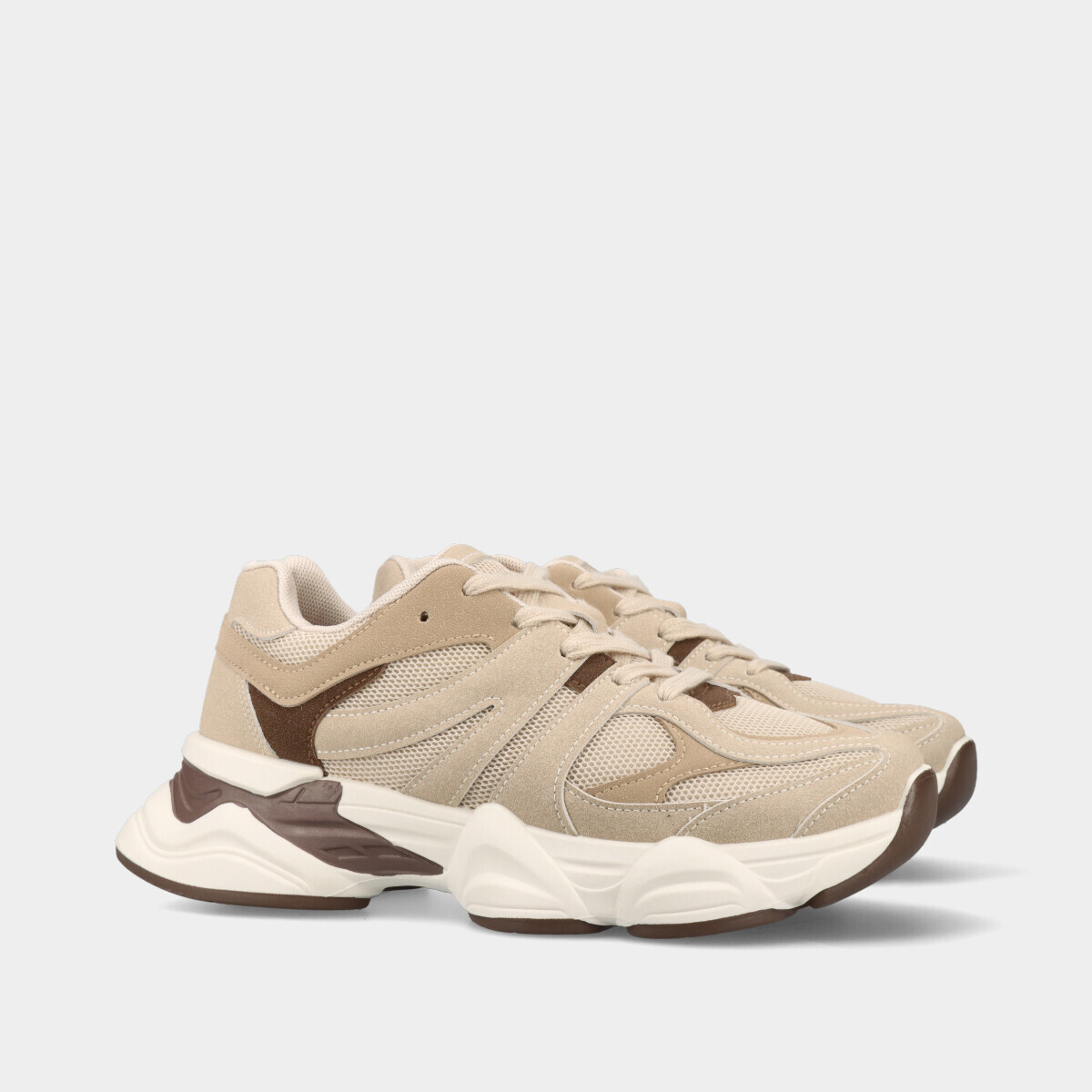 Ténis desportivos para mulher em bege, com atacadores, malha respirável e palmilha removível de espuma, ideais para desporto, ginásio, caminhadas ou uso casual.