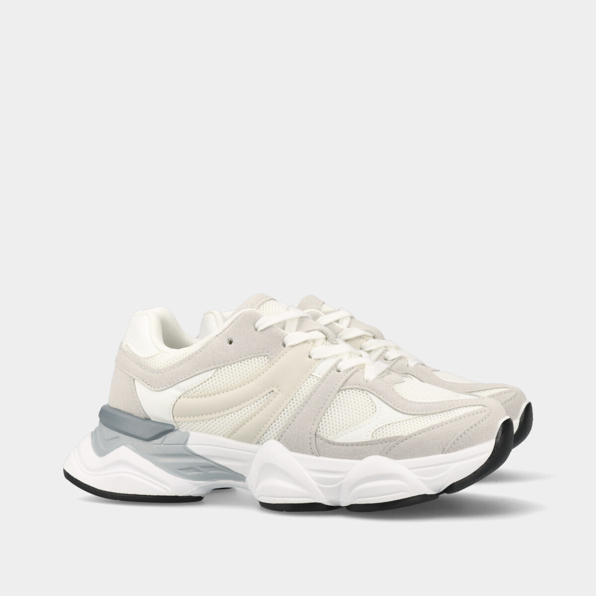 Ténis desportivos para mulher em branco e cinza, com atacadores, malha respirável e palmilha removível de espuma, ideais para desporto, ginásio, caminhadas ou uso casual.
