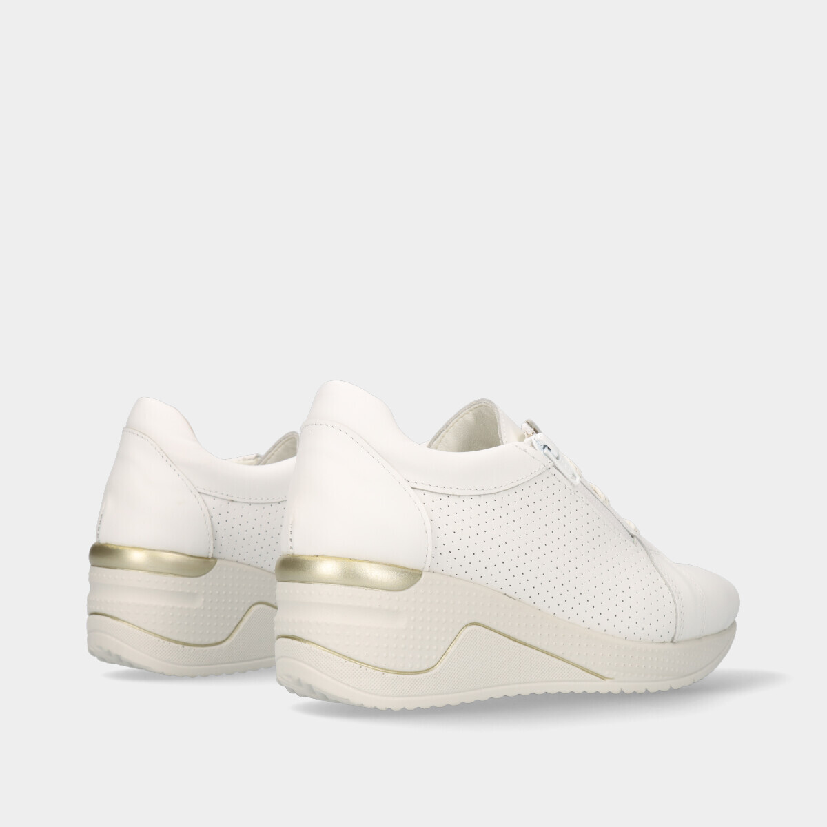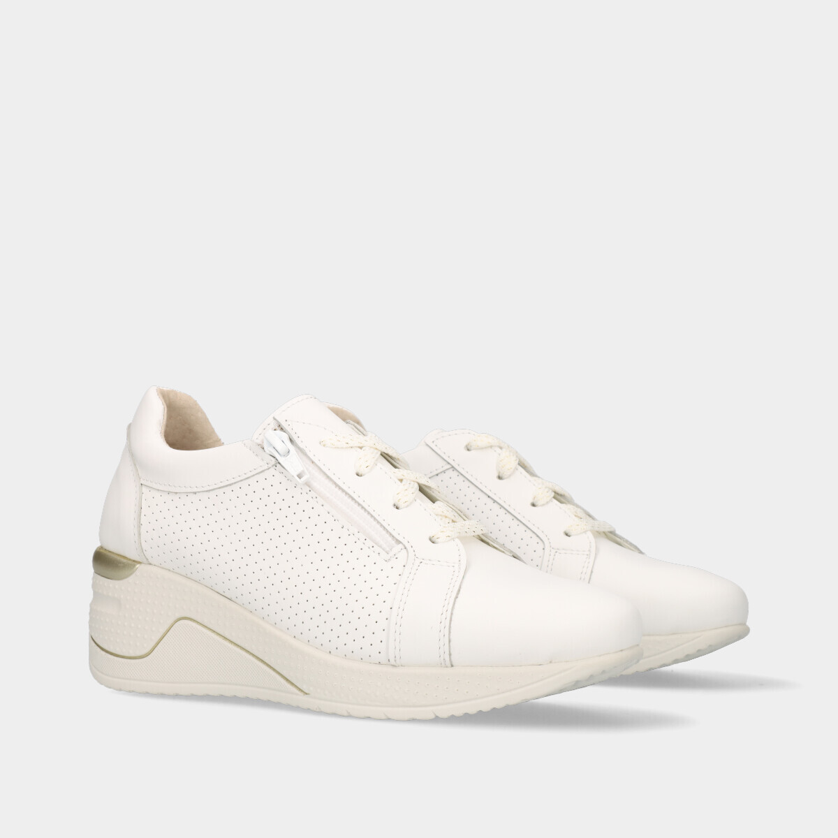 Estas sapatilhas em branco combinam estilo e conforto, apresentando um design moderno com um toque subtil de elegância! Com perfurações laterais e uma cunha discreta que oferece altura extra sem comprometer o conforto, são ideais para o uso diário. O detalhe dourado na parte traseira adiciona um toque de sofisticação. Equipadas com cordões e um prático fecho lateral, estas sapatilhas são perfeitas para um look casual e elegante.
