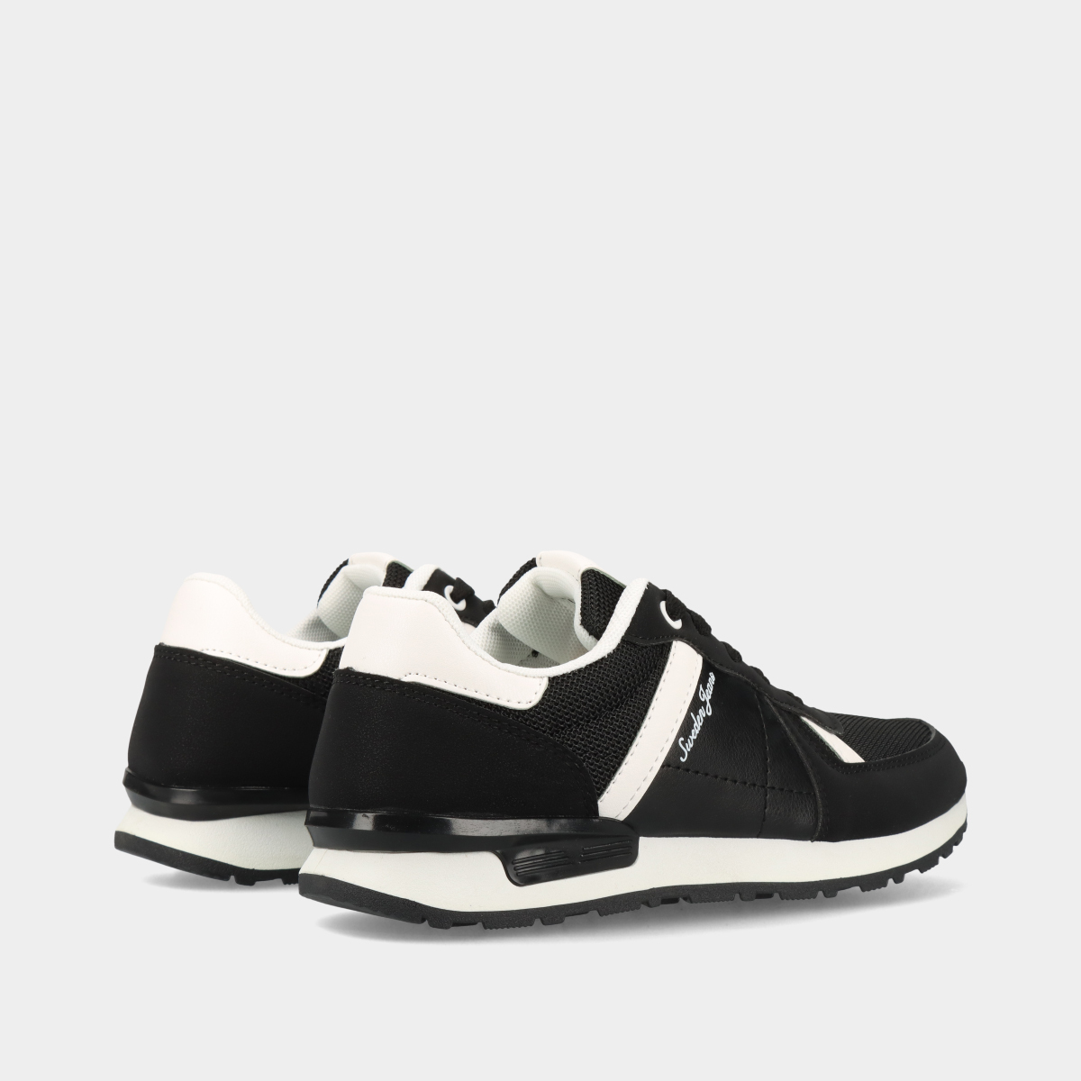 Ténis para mulher em preto e branco com atacadores, forro confortável e sola de borracha. Perfeitos para looks elegantes e práticos.