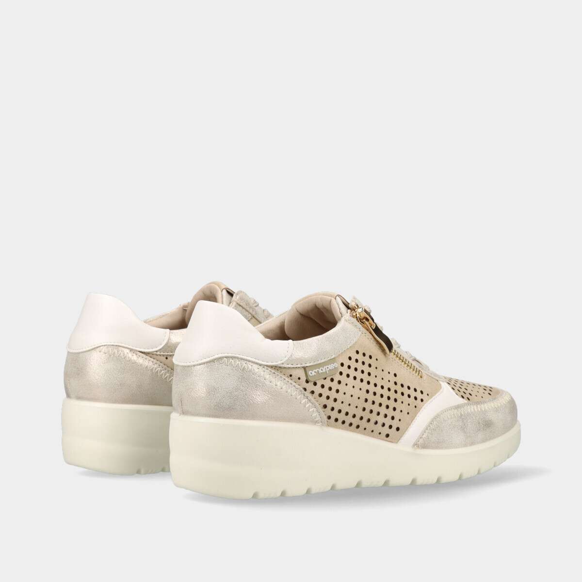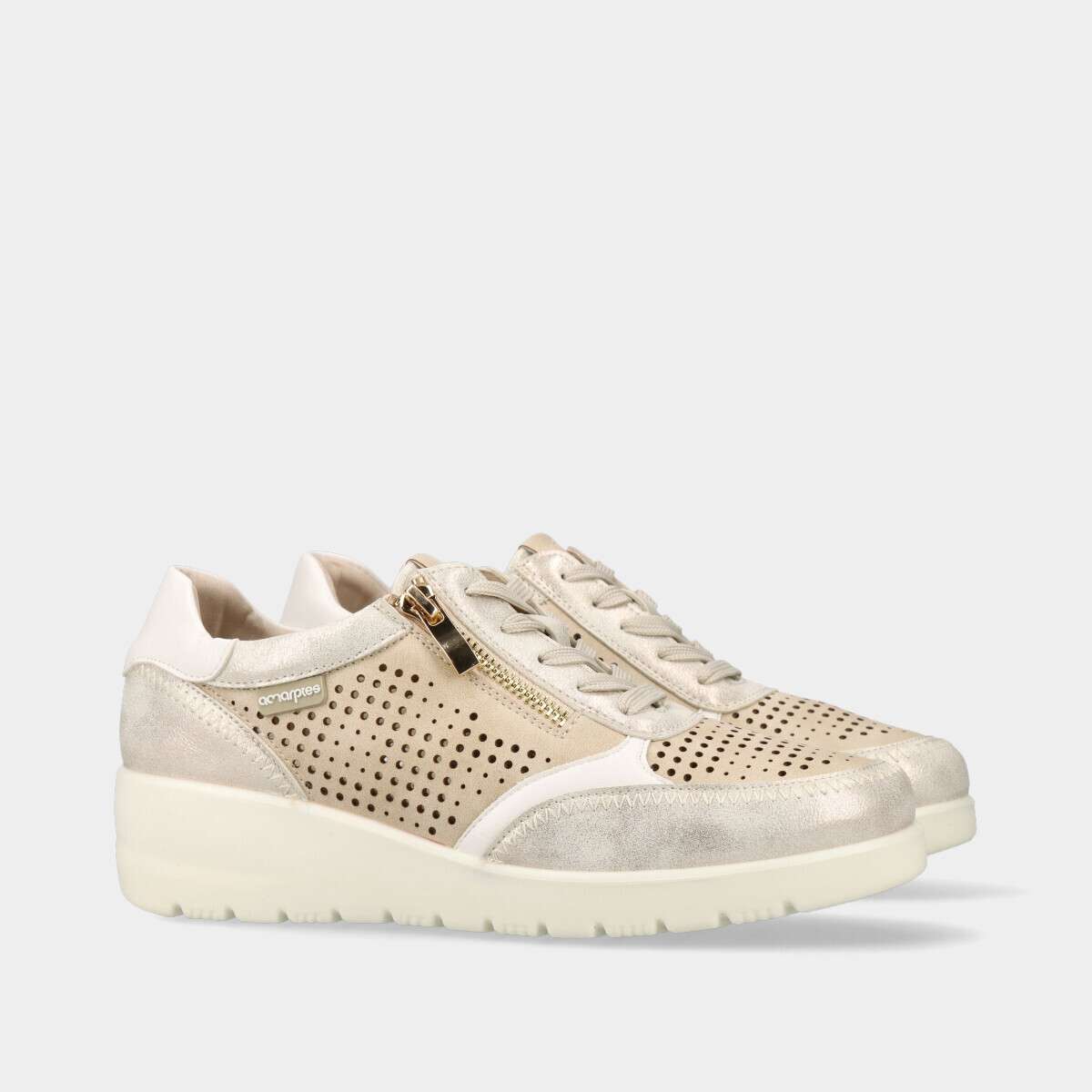 Ténis de conforto em bege com acabamento brilhante, com cordão e prático fecho lateral que facilita o calçar e descalçar.