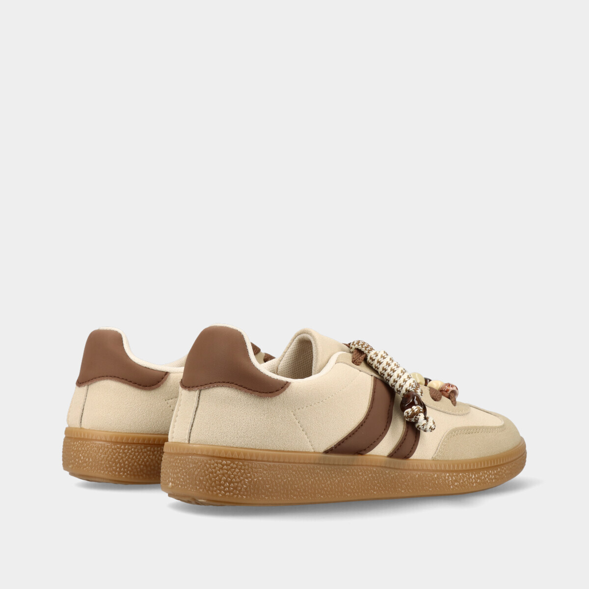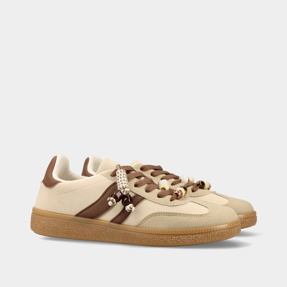 Ténis para mulher em bege com pormenores em contraste, aplicações removíveis nos atacadores, forro confortável e sola de borracha. Perfeitos para looks elegantes e práticos.