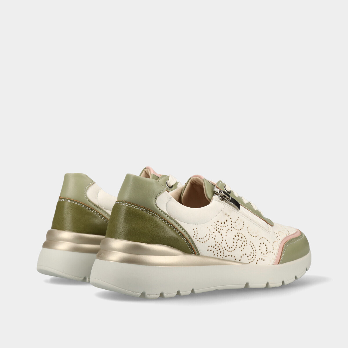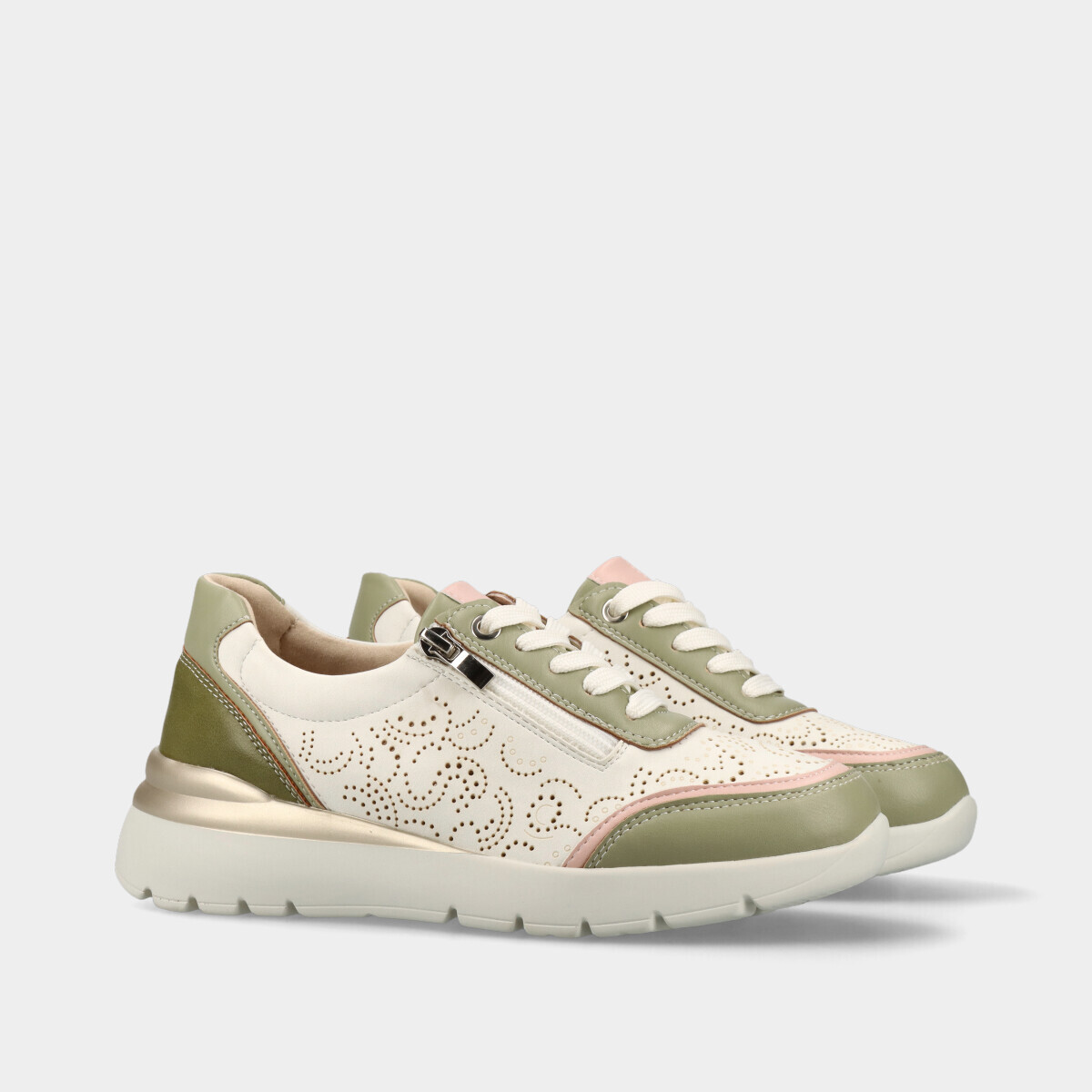 Ténis para mulher em branco com pormenores em rosa e verde, leves e confortáveis, com perfurações que ajudam a manter o pé fresco e palmilha acolchoada para maior conforto ao caminhar. Ténis femininos com atacadores e fecho lateral, fáceis de calçar e versáteis, ideais para o dia a dia, passeios urbanos e looks casuais, oferecendo estilo, frescura e máximo conforto.