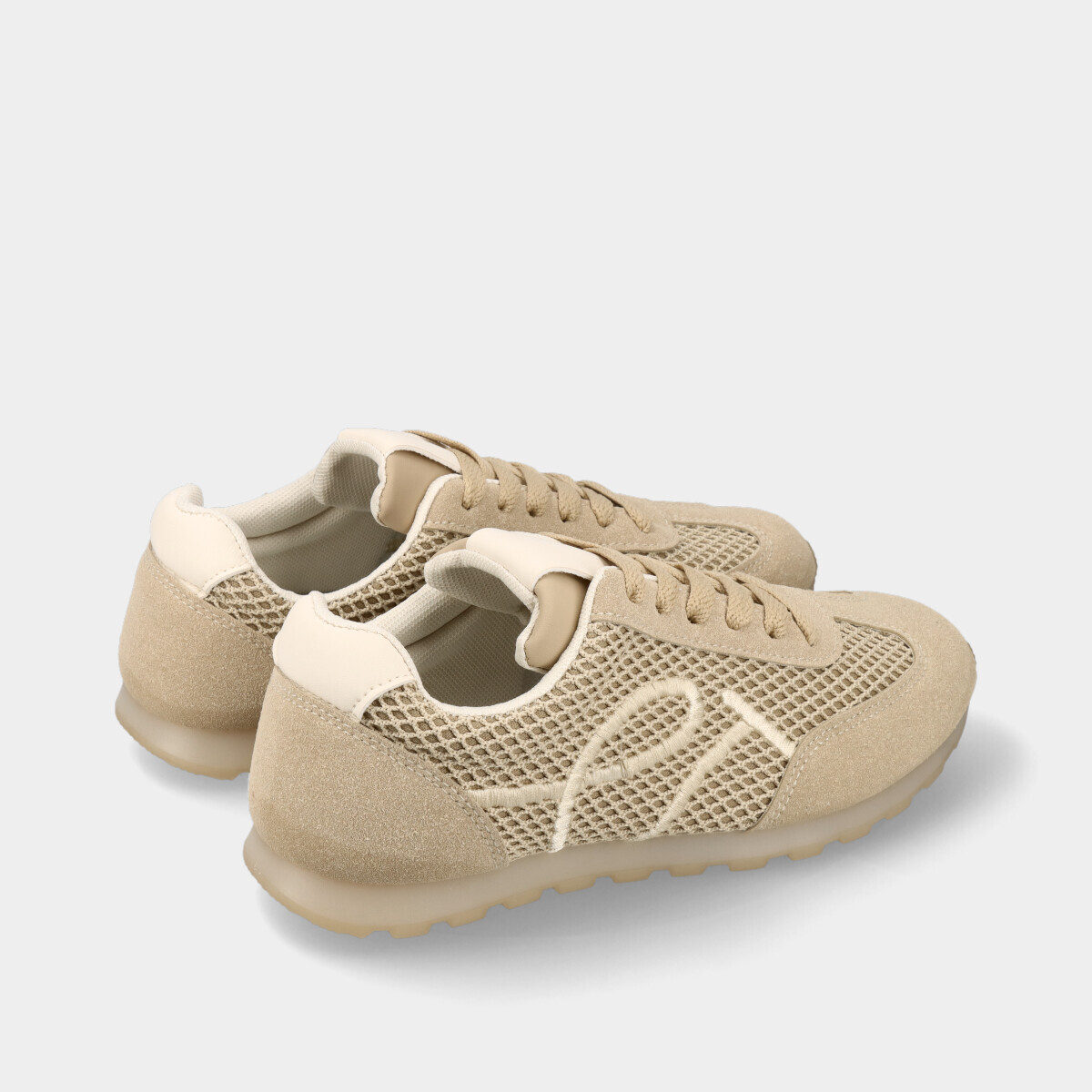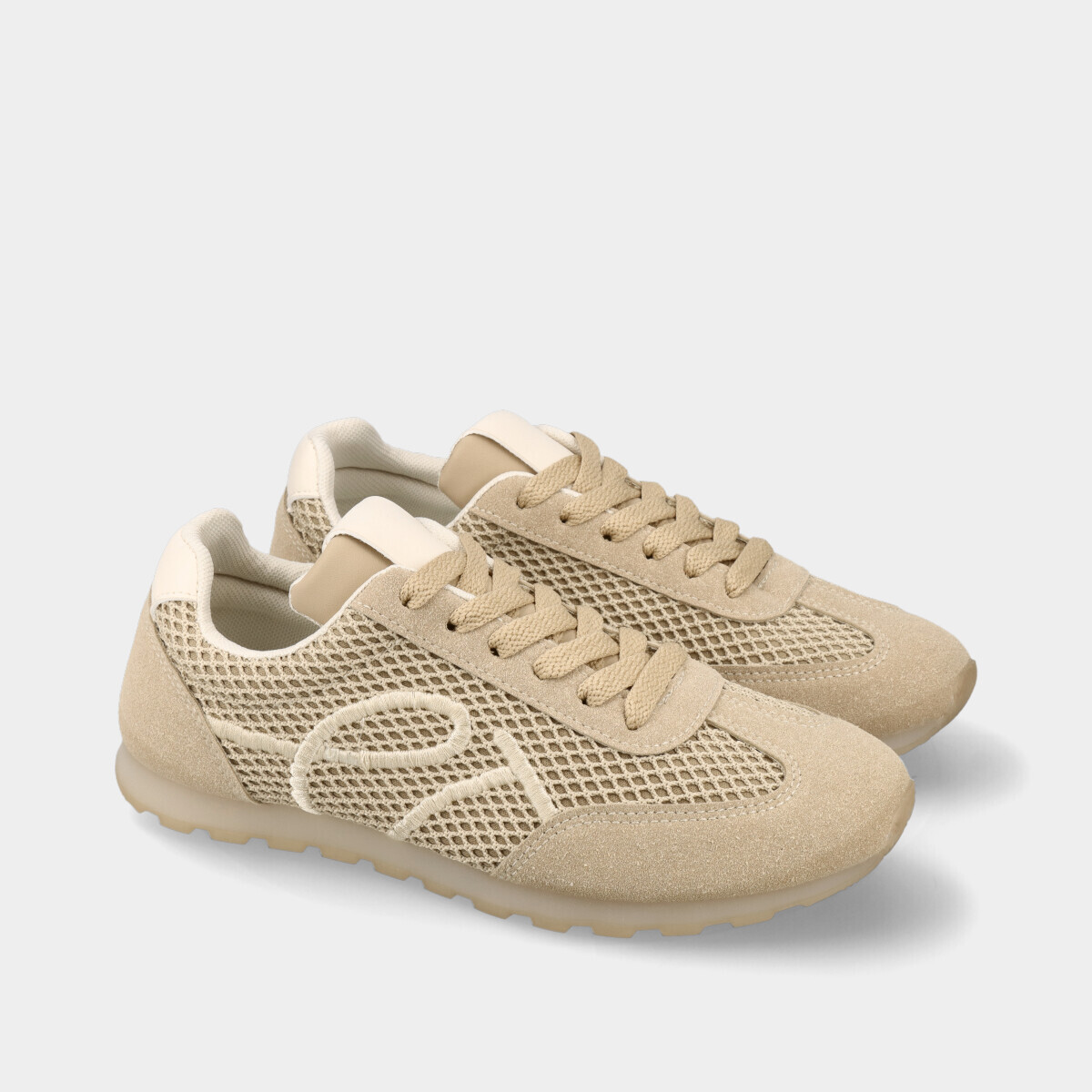 Ténis para mulher em taupe, com laterais em rede mesh, atacadores, forro confortável e sola de borracha. Perfeitos para looks elegantes e práticos.