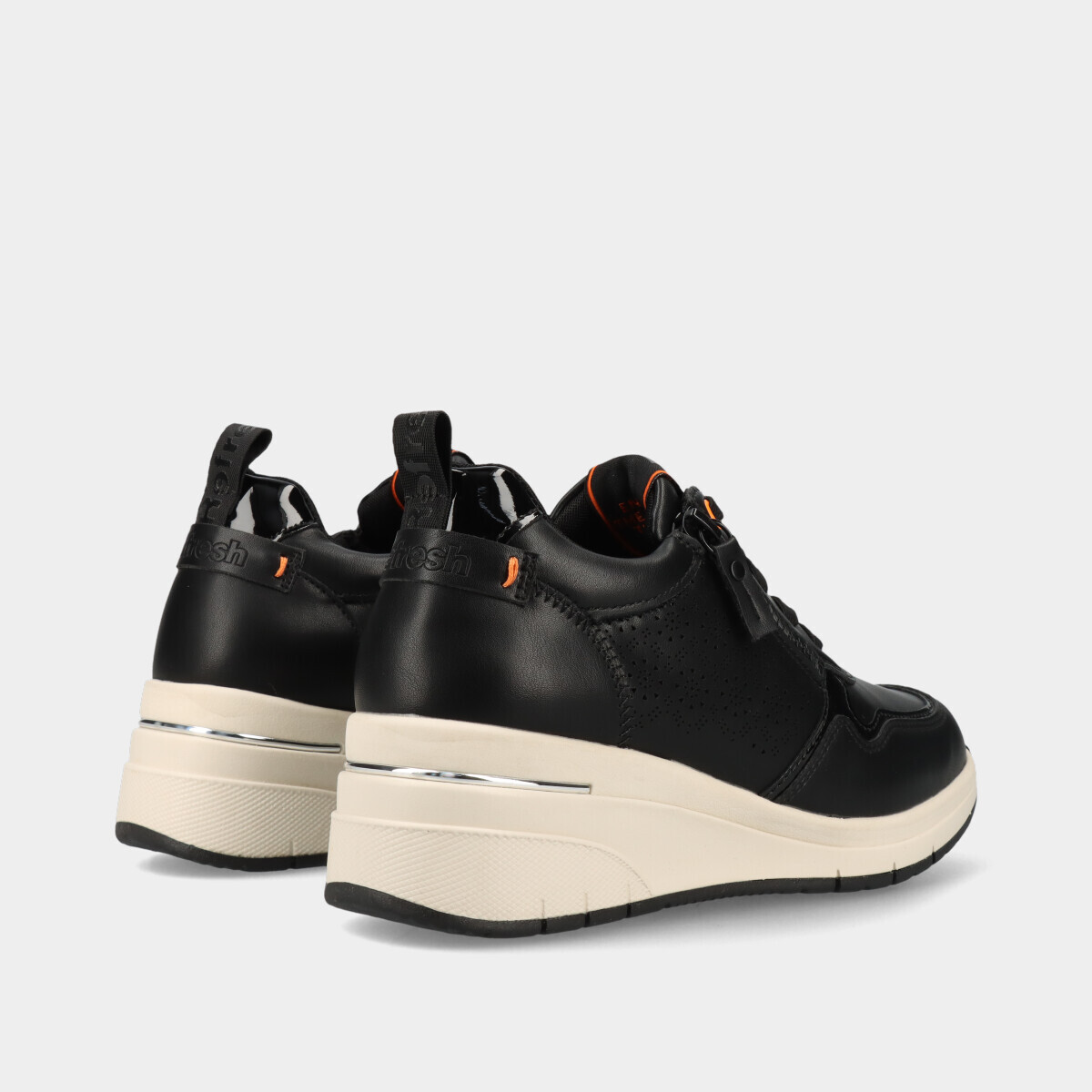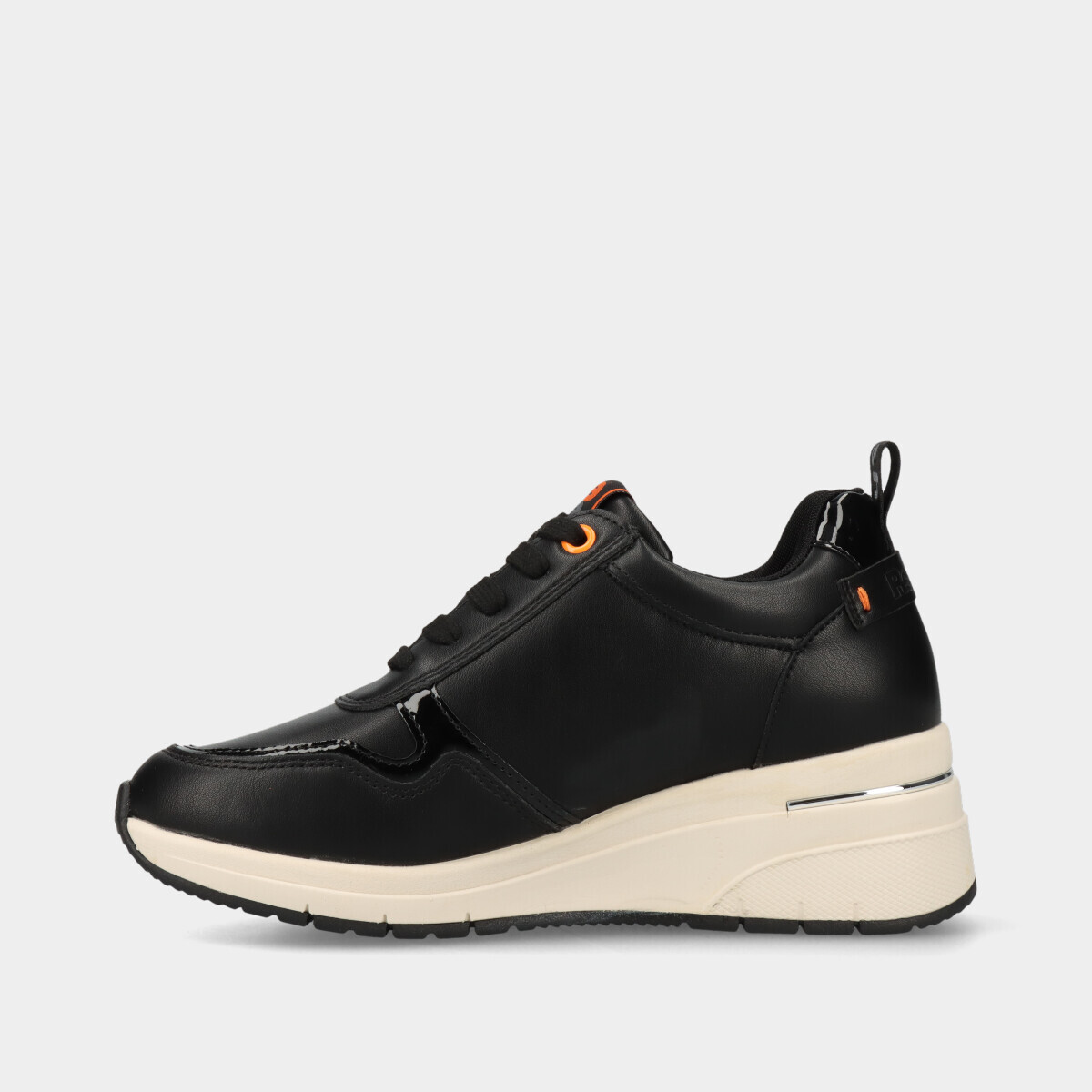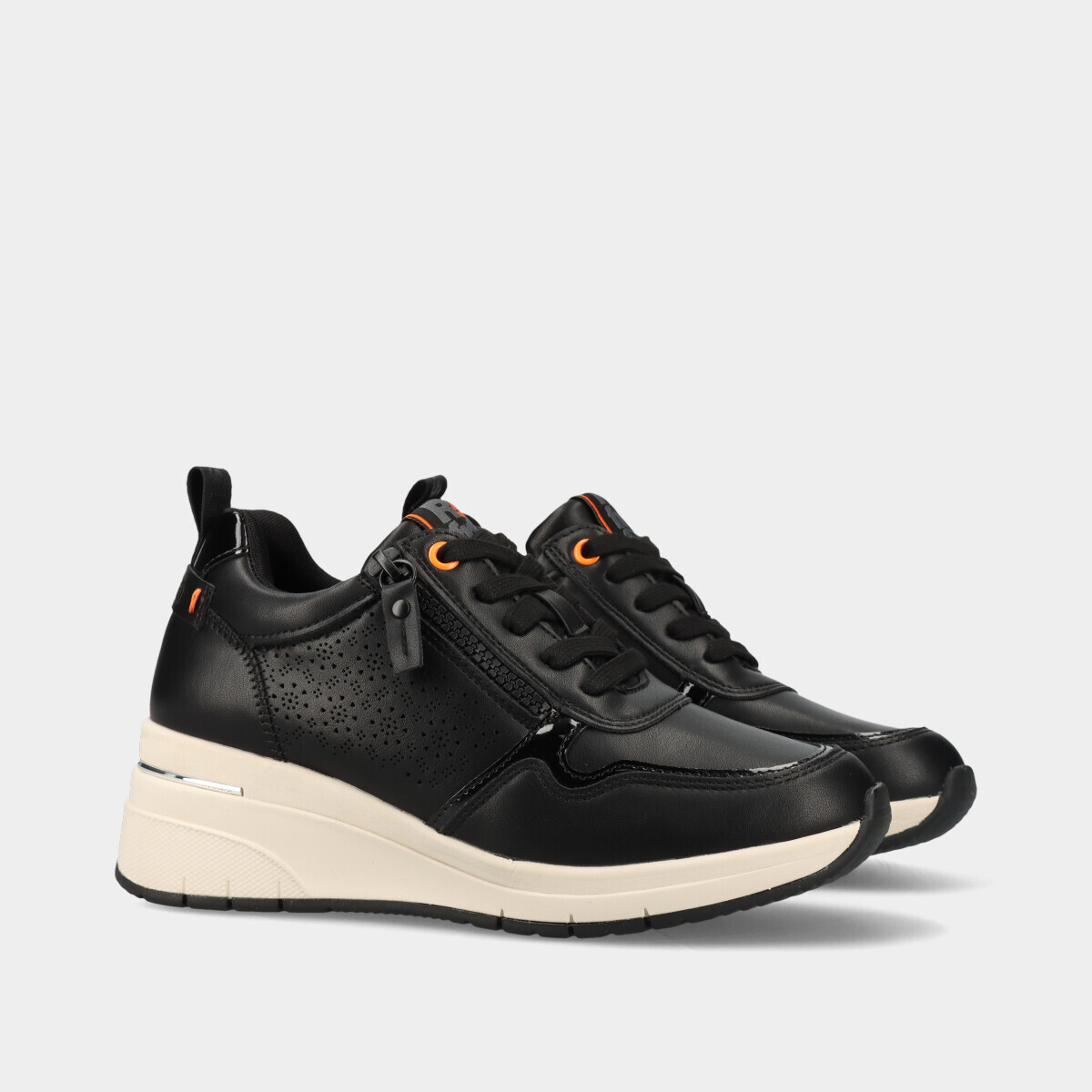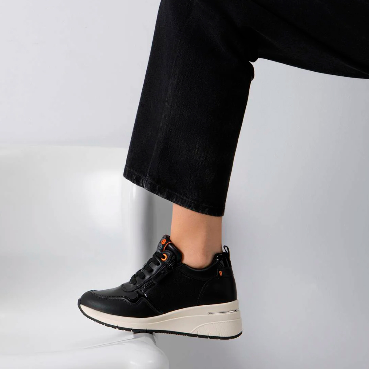 Ténis de cunha pretos com detalhe decorativo lateral. Palmilha em espuma viscoelástica, muito confortável e que se molda ao pé. Fecho lateral e atacadores ajustáveis, com puxador no calcanhar. Certificação vegana da PETA (Organização de Direitos dos Animais) garante que este calçado é 100% livre de produtos de origem animal.