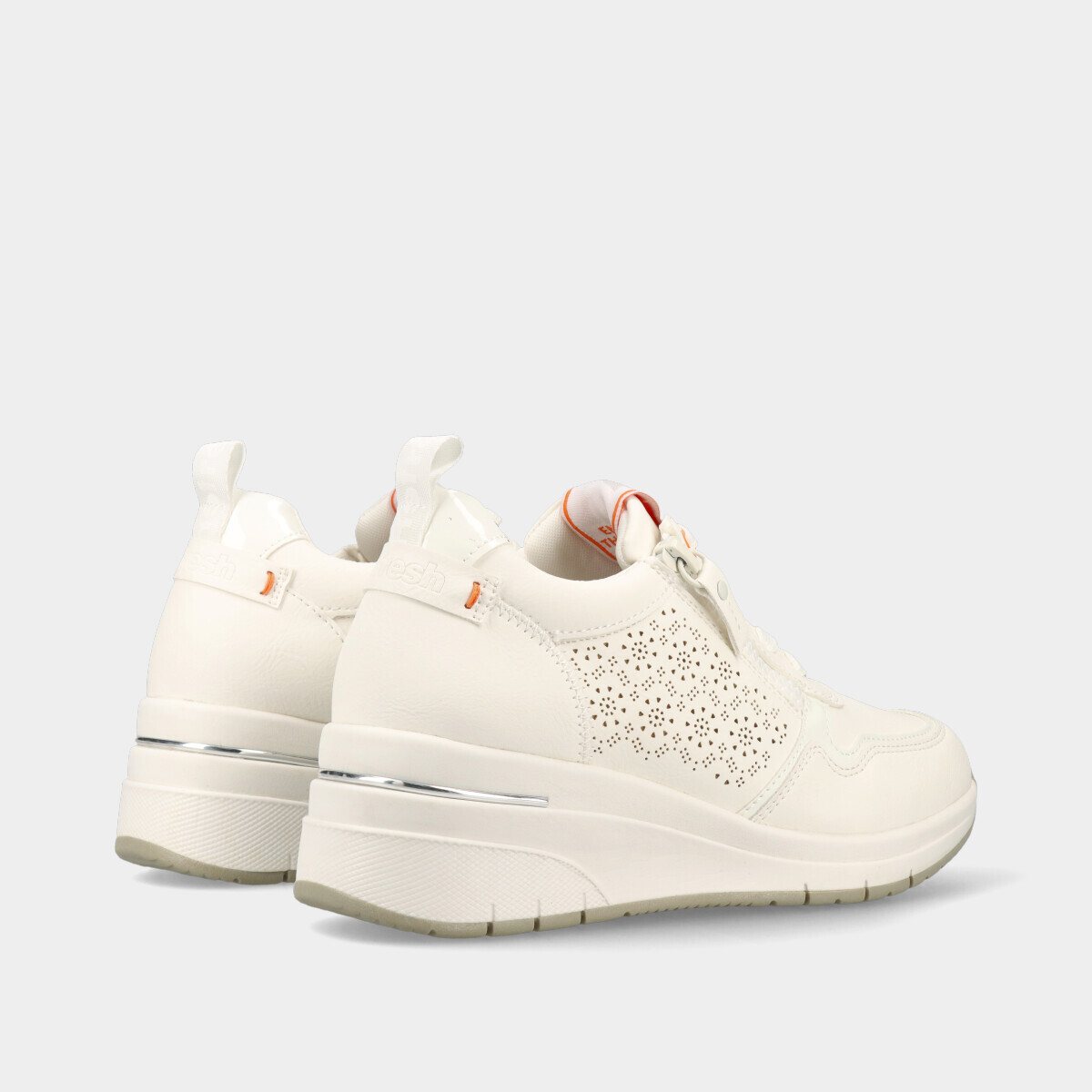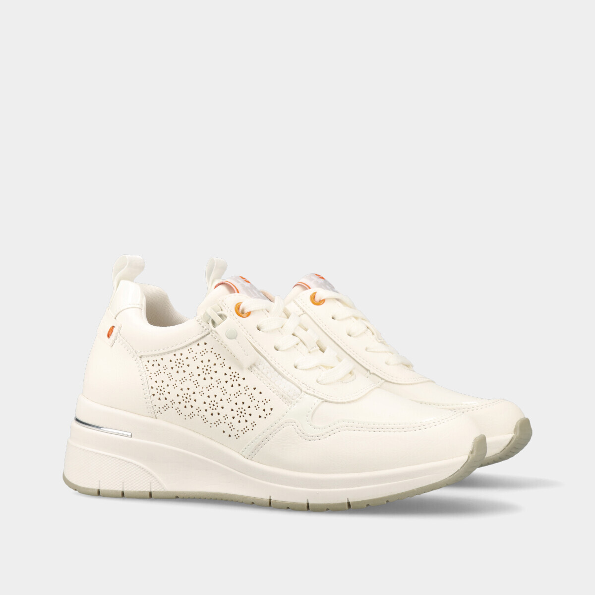 Ténis de cunha brancos com detalhe decorativo lateral. Palmilha em espuma viscoelástica, muito confortável e que se molda ao pé. Fecho lateral e atacadores ajustáveis, com puxador no calcanhar. Certificação vegana da PETA (Organização de Direitos dos Animais) garante que este calçado é 100% livre de produtos de origem animal.