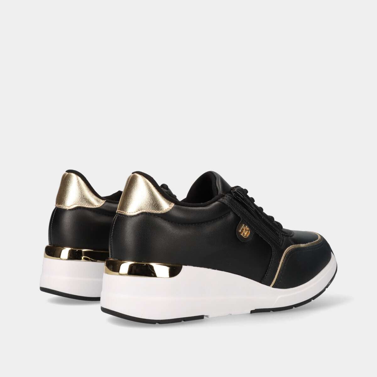 Sapatilha de cunha na cor preta com pormenores em dourado, cordão, fecho lateral e palmilha de espuma extremamente confortável.