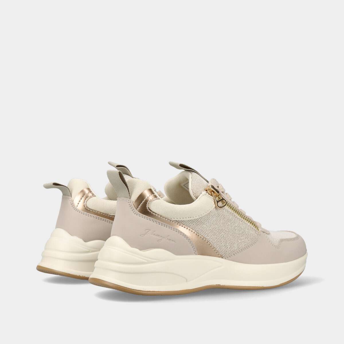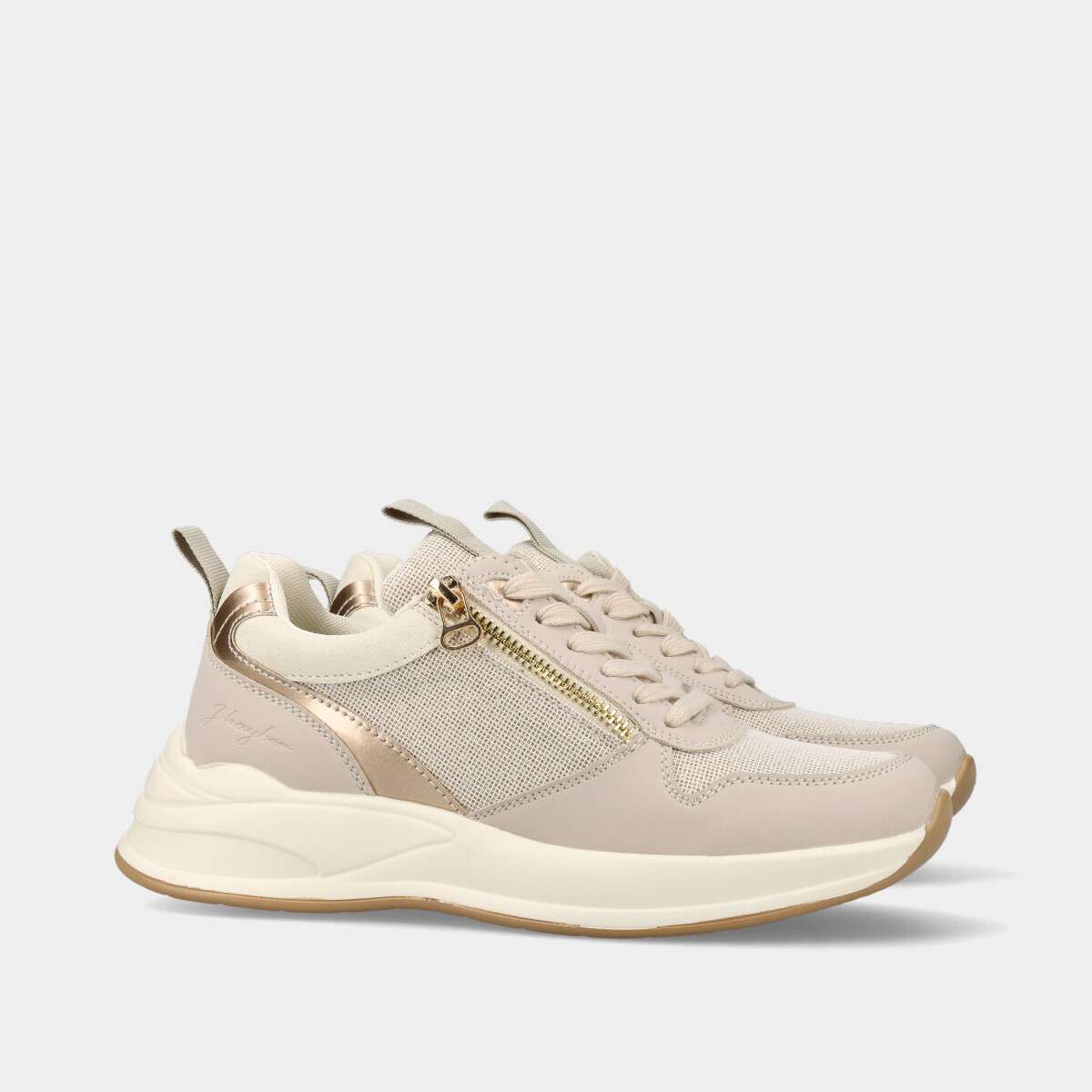 Tênis confortável na cor bege com detalhes em contraste e brilho, de fecho lateral e cordão.