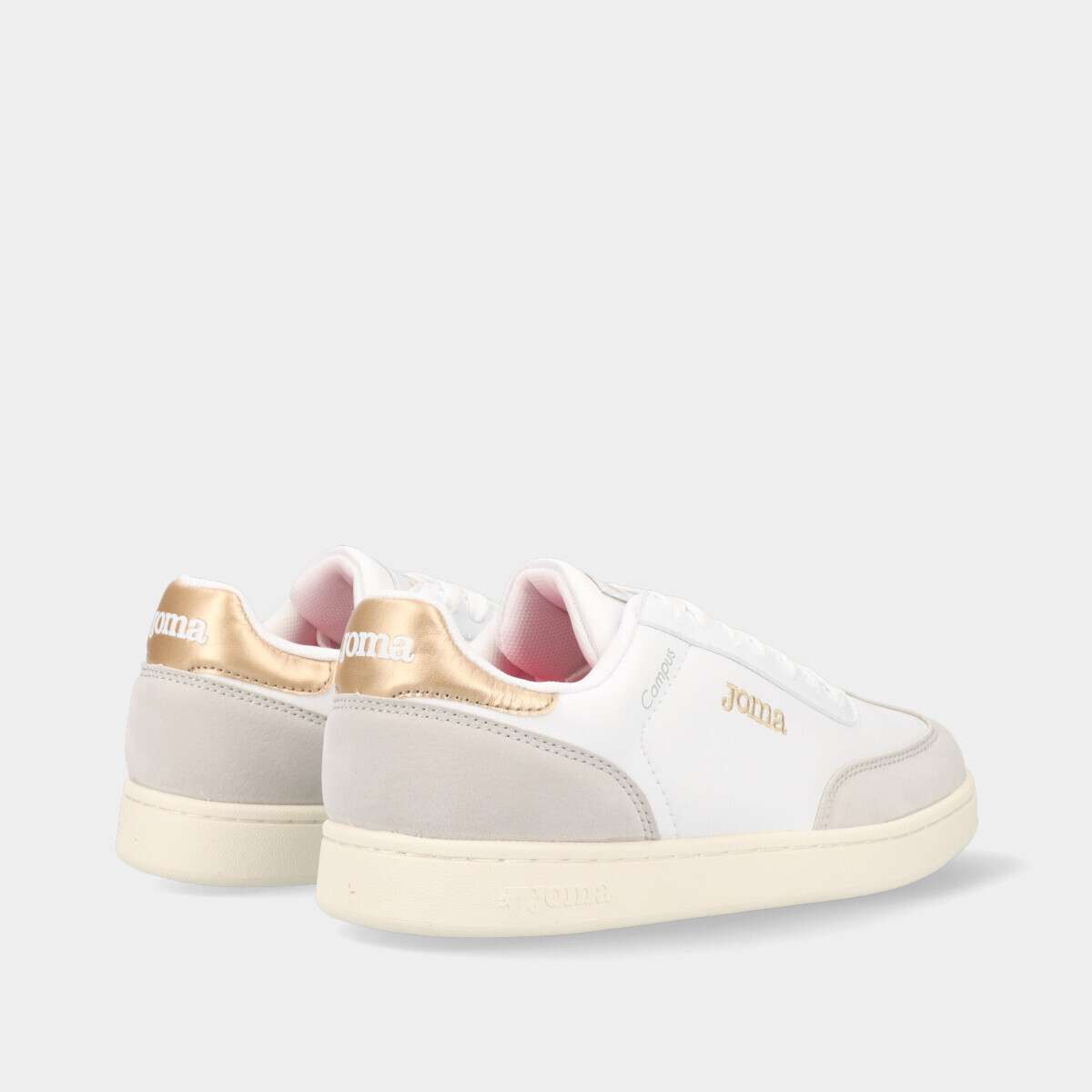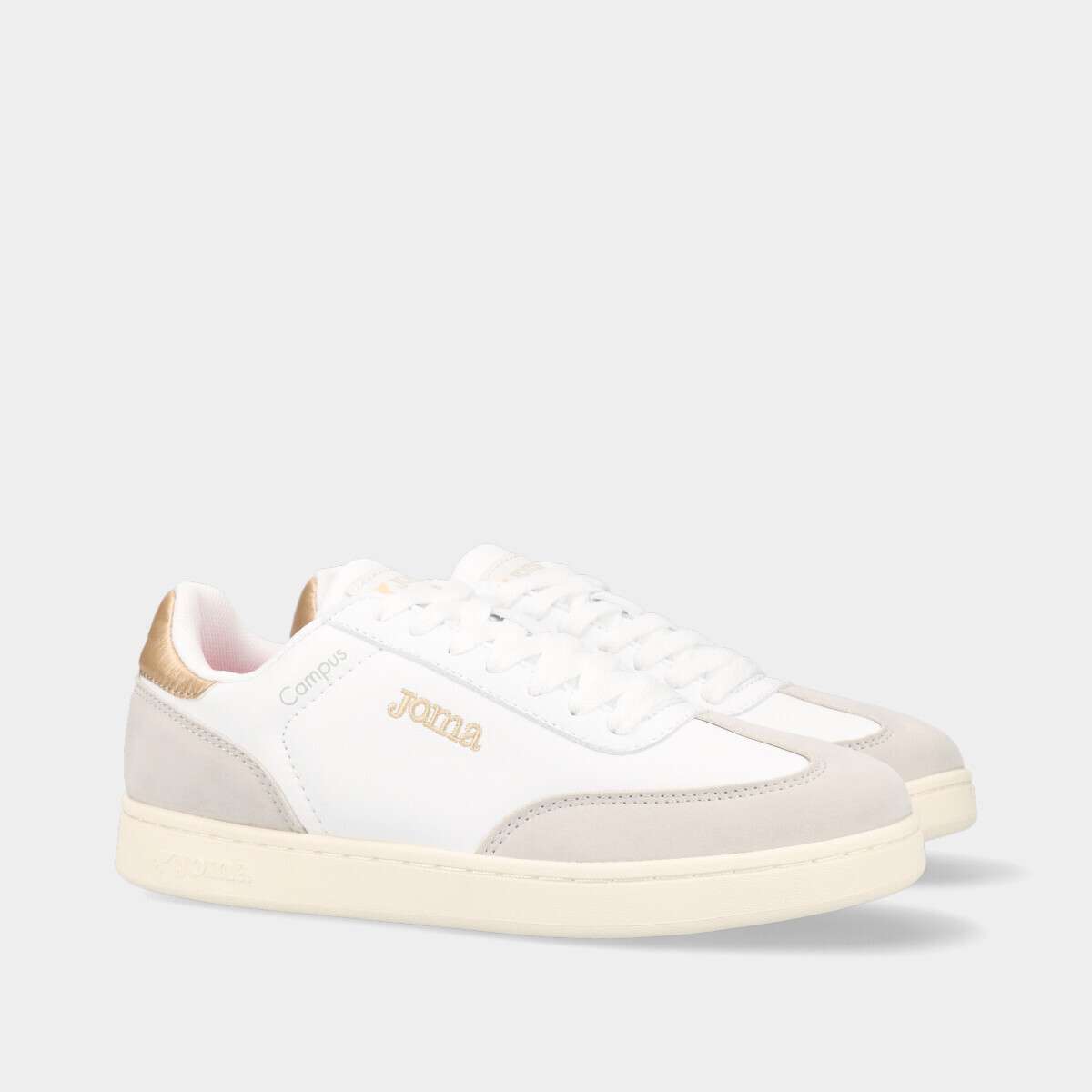 Tênis na cor branca com pormenores em cinza e bronze, palmilha MEMORY FOAM, sola de borracha DURABILITY e cordão.