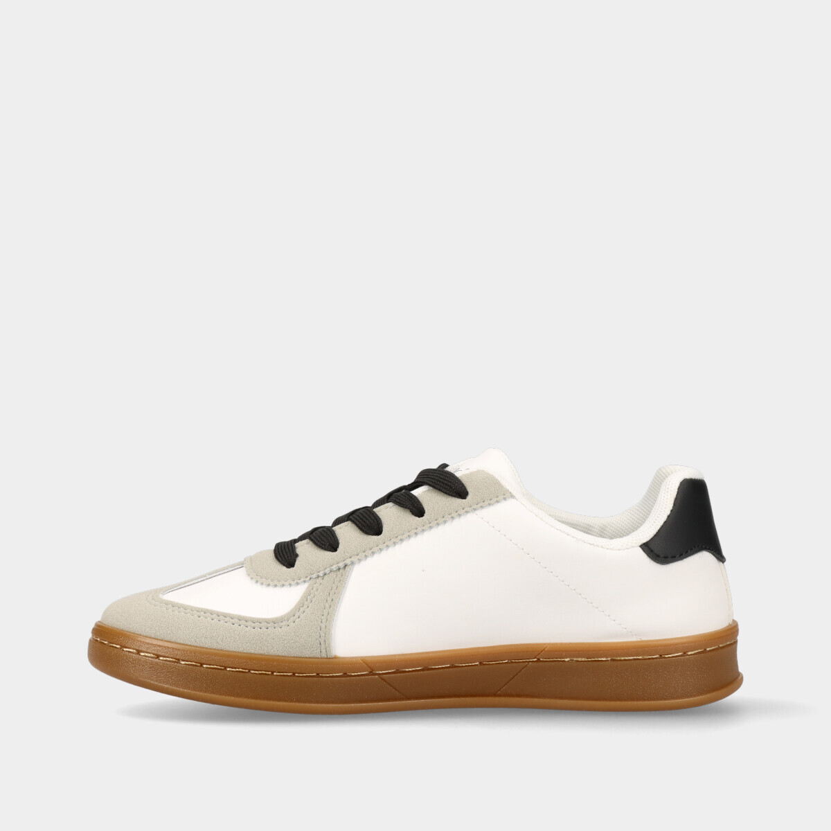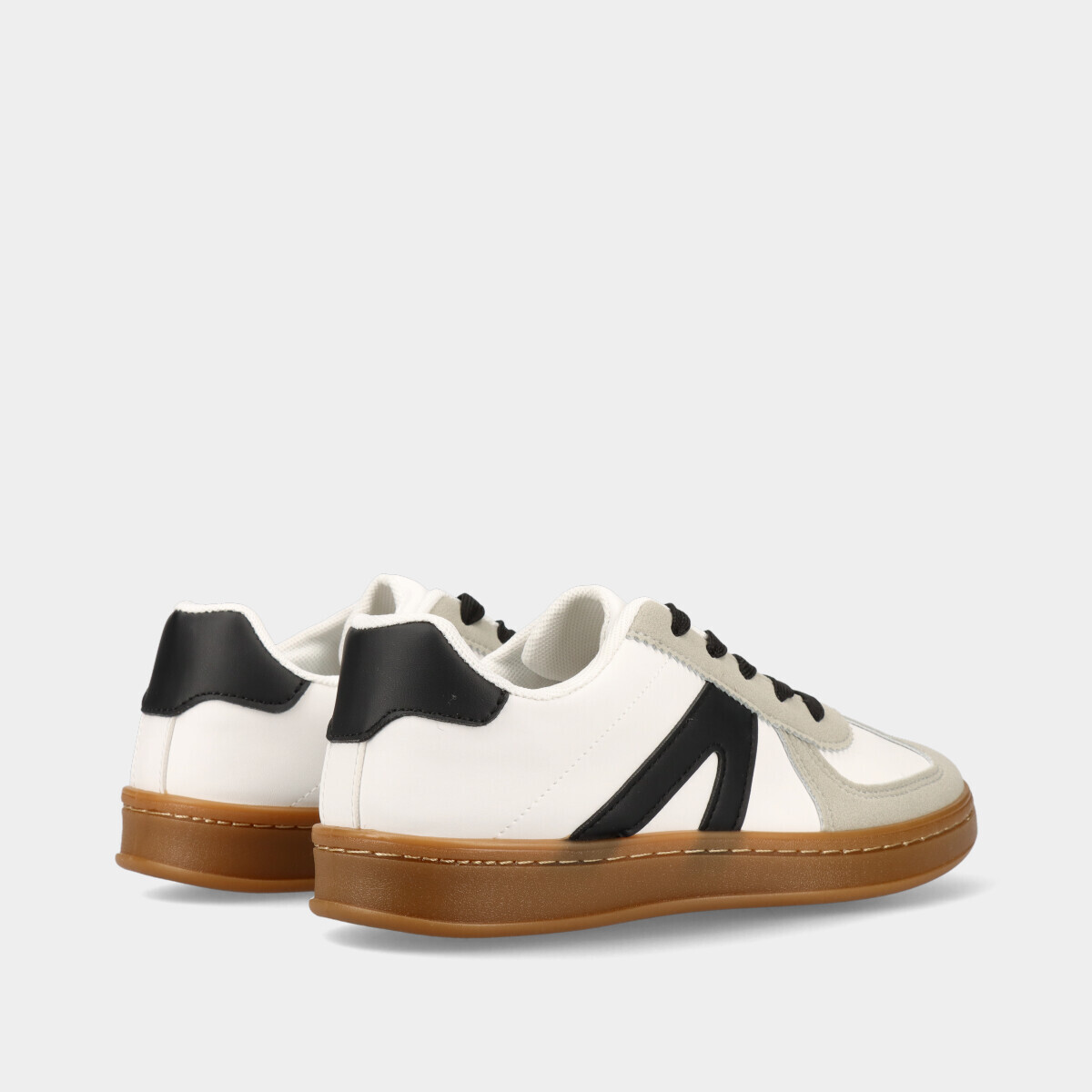 Ténis casuais unissexo em branco, com detalhes em preto e cinza, atacadores, forro e palmilha confortáveis para uso diário.
