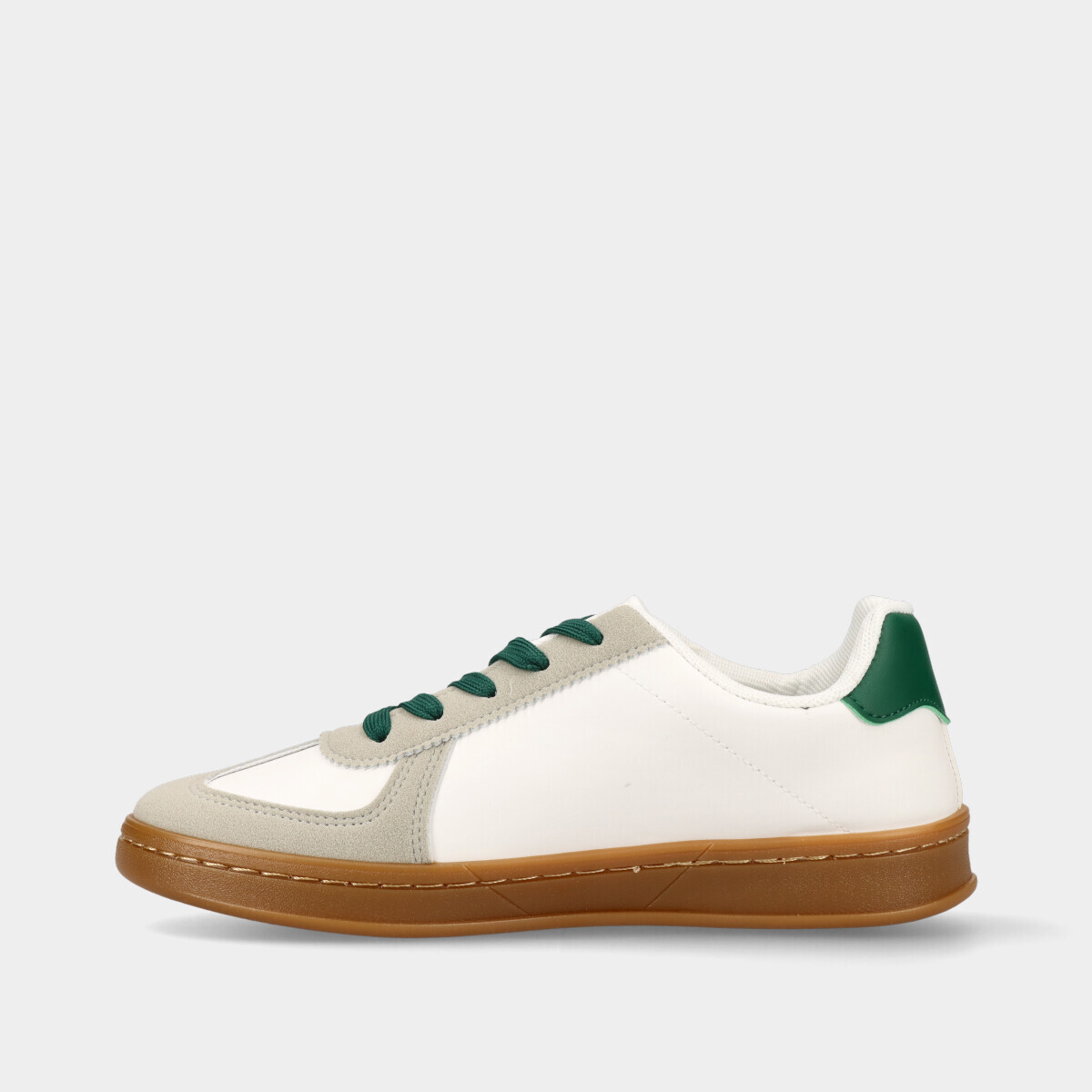 Ténis casuais unissexo em branco, com detalhes em verde e cinza, atacadores, forro e palmilha confortáveis para uso diário.