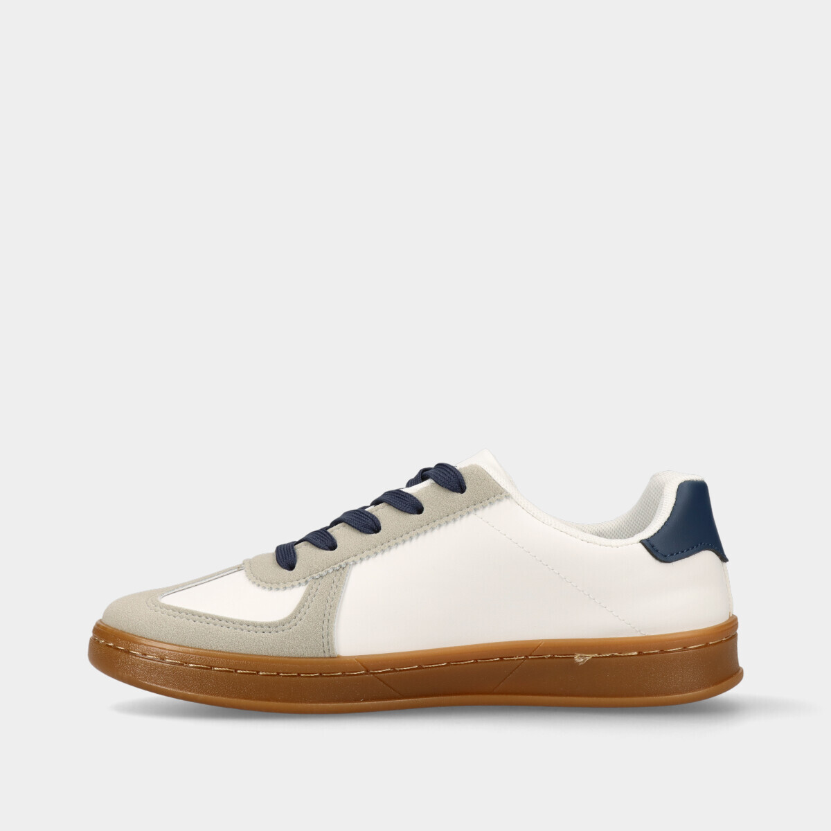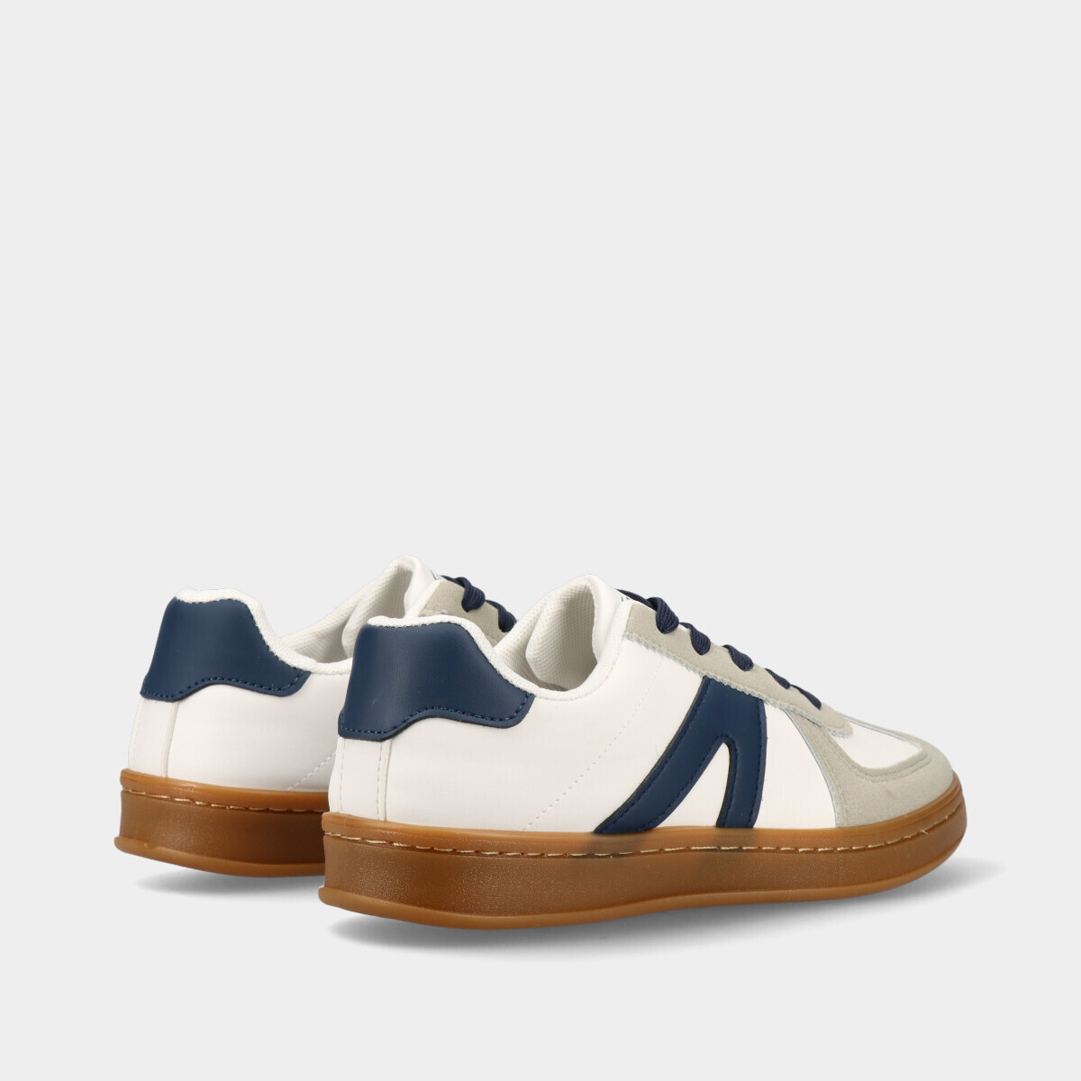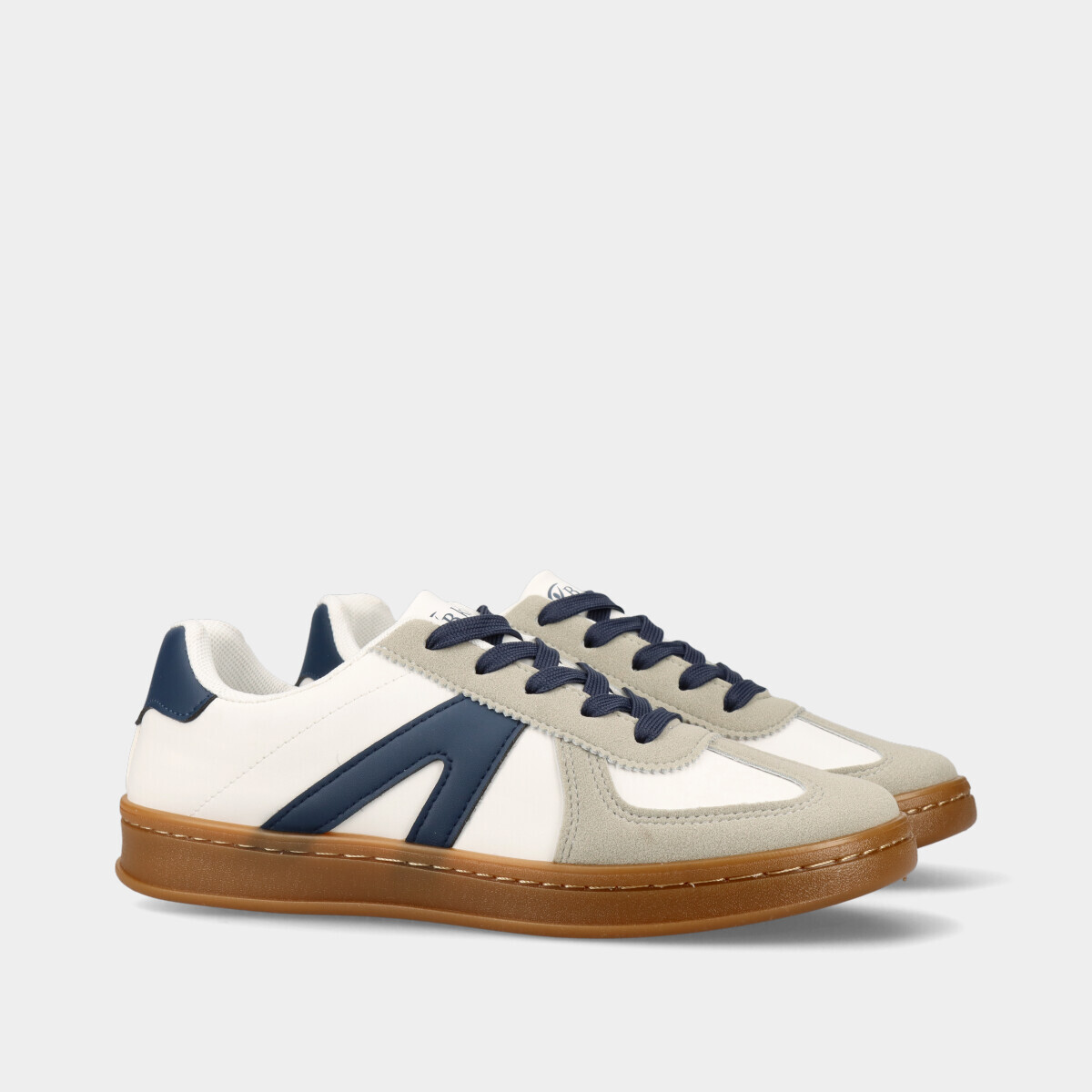 Ténis casuais unissexo em branco, com detalhes em azul e cinza, atacadores, forro e palmilha confortáveis para uso diário.