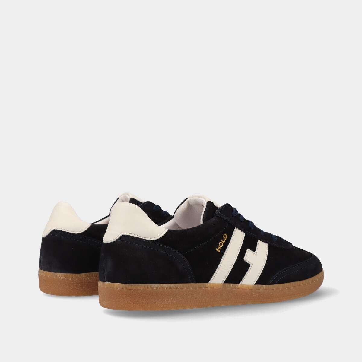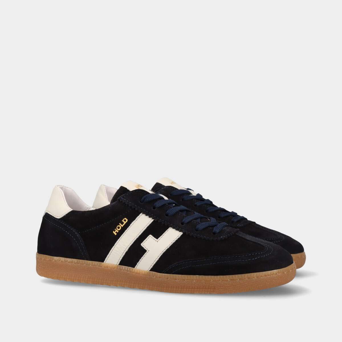 Tênis casual em pele na cor azul com pormenores em branco, de cordão.