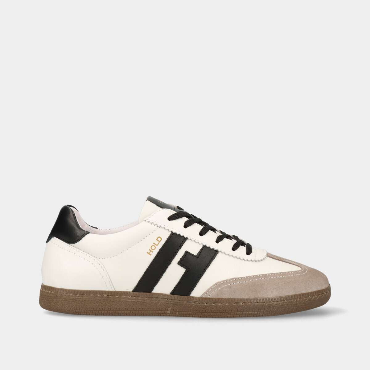 Tênis casual em pele na cor branca com pormenores em preto, de cordão.