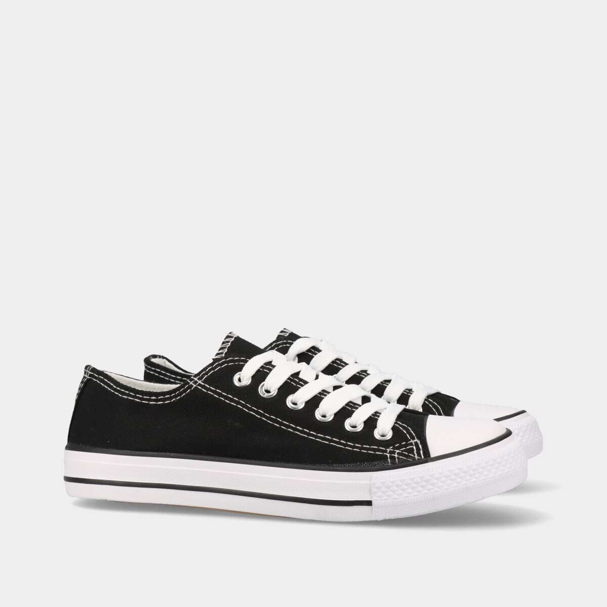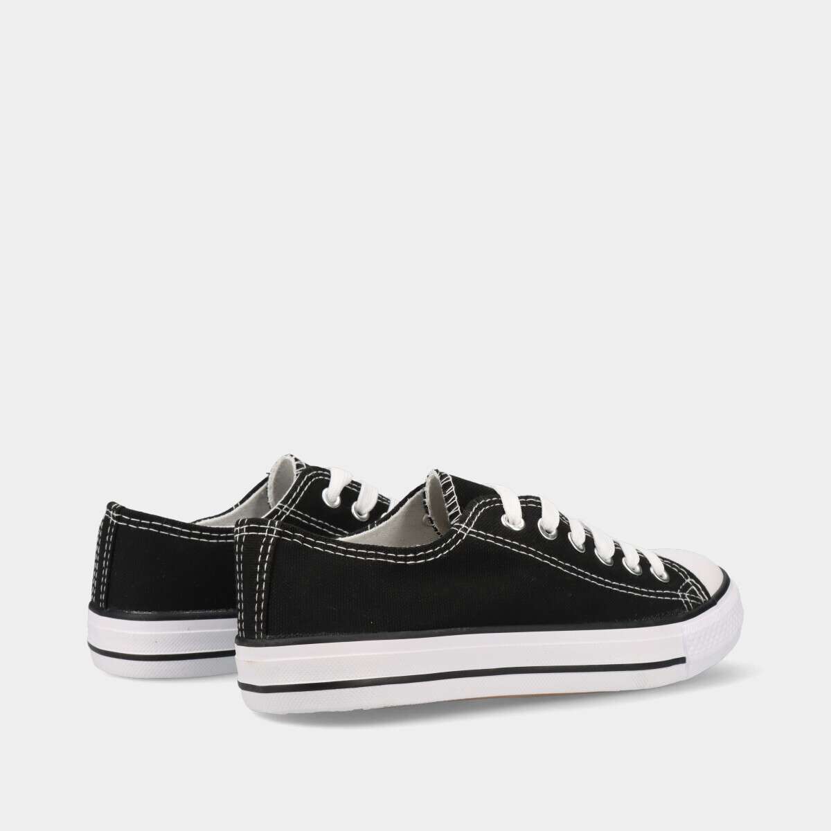 Ténis unissexo em lona preta com cordões brancos e sola de borracha branca com risca preta.